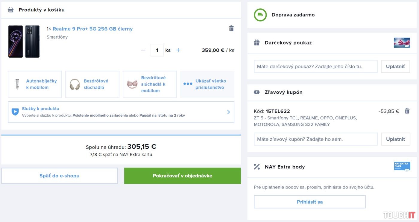 Zníženie ceny zo 419 eur na 305 eur je dané aktuálnou akciou v NAY (zľava zo 419 eur na 359 eur) v kombinácii s uplatnením zľavového kupónu 15TEL622, ktorý zníži túto cenu o ďalších 14 % na výsledných 305 eur. Realme 9 Pro+ 5G je dostupný v čiernej, zelenej a modrej farbe.
