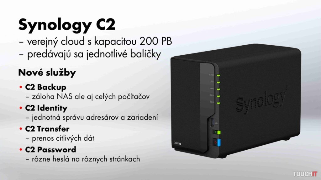 Najdôležitejšia je C2 Backup ako cloudová ochrana dáta pre distribuované koncové body. Zálohujú sa celé NAS servery, ale aj celé počítače bez toho, aby ste museli vlastniť Synology NAS. C2 identity znamená jednotnú správu adresárov a zariadení. Je určená pre používateľov využívajúcich hybridné cloudové služby z rôznych miest. C2 Password je nástroj na správu hesiel. Zjednodušuje situáciu, že chcete používať na rôznych stránkach rôzne heslá a nechcete si ich pamätať. C2 Transfer poskytuje bezpečný spôsob ako prenášať citlivé dáta medzi rôznymi lokalitami.
