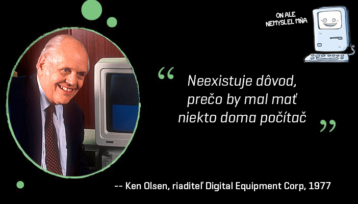 Vezmite si napríklad známe vyjadrenie Kena Olsena, zakladateľa spoločnosti Digital Equipment Corp. (v minulom storočí bola DEC významná firma na poskytovanie firemných počítačových riešení), ktorý v roku 1977 povedal „Neexistuje dôvod na to, aby mal niekto doma počítač“.