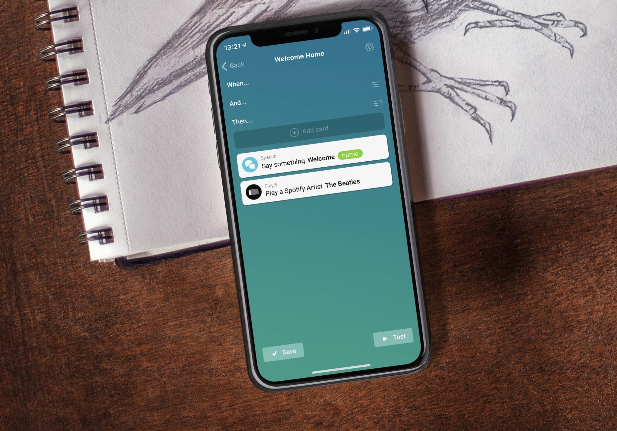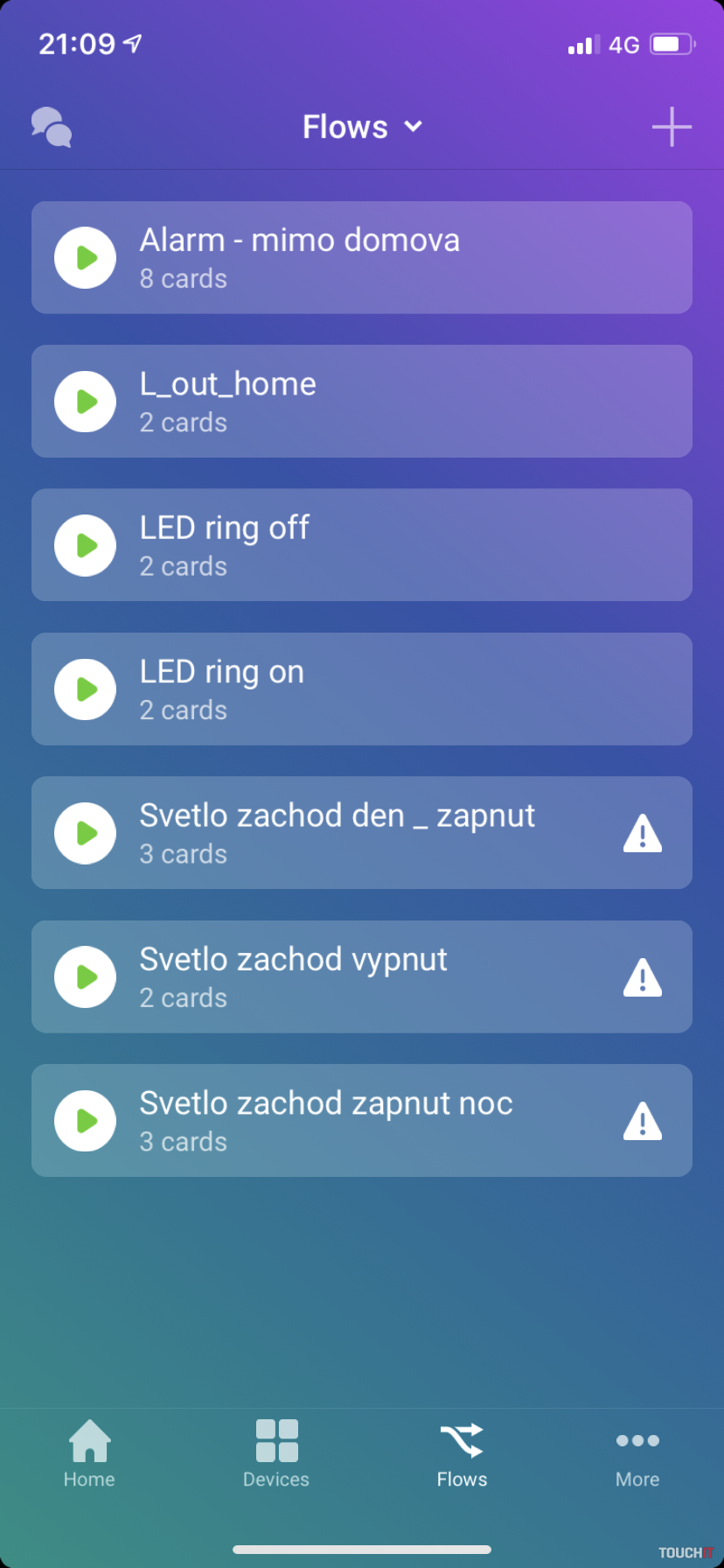 Prváje domovská stránka, kde si môžete pridať obľúbené zariadenia alebo scény. Taktiež tu vidíte časovú os najdôležitejších udalostí. Druhá plocha sú zariadenia, teda pridávanie, ktoré je rovnaké ako v prvej generácii, akurát to vykonávate pomocou aplikácie. Kliknete na ikonu „+“, zvolíte aký druh zariadenia chcete pridať – väčšinou je to aplikácia, ktorú si pred samotným pridávaním nového zariadenia stiahnete v internom obchode s aplikáciami. Ak to pridané zariadenia umožňujú, tak ich v tejto sekcii môžete aj podrobnejšie nastavovať. Tretia plocha sú flows, teda scény a ich tvorba na základne podmienok. Táto položka je krásne spracovaná a tvorba pokročilých scén bude pre väčšinu používateľov veľmi jednoduchá. Vždy ide o tri základné piliere (When/And/Then), ktoré pracujú na základe podmienok – „ak sa stane toto, prípadne toto, tak nastane toto a tamto spustí hento“. Jednoduchšie to už ani nemôže byť, čo poviete?