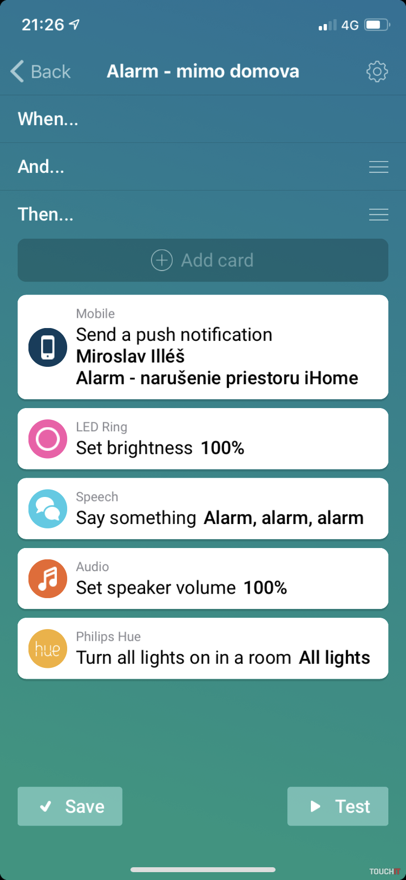 „Kombinovať môžete podmienky času, dátumu, ročného obdobia, západu/východu slnka, prítomnosti osôb v domácnosti, polohy, aktivácie zariadení, zmeny stavu, alarmu, už vytvorených scén a pod. Príklady scén je ťažko uvádzať, nakoľko veľa záleží od toho, aké zariadenia budete používať a ako sa majú v súčinnosti s ostatnými funkciami správať. Nakombinovať sa dajú skutočne rôznorodé zariadenia, ktoré budú pracovať na základe rôznych, aj naozaj netradičných podmienok. Bežným príkladom sú scény – ráno, večer, noc a odchod/príchod z/do domu alebo neprítomnosť. Každá scéna sa bude automaticky riadiť podľa vašich nastavení a želaní.“