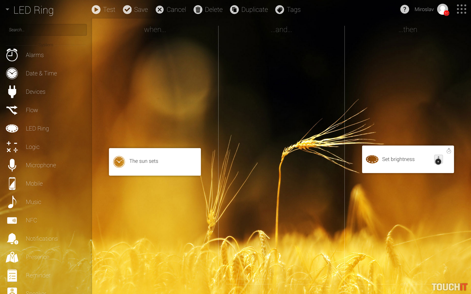 Spomenúť musíme aj možnosť hlasového ovládania podľa predvolených alebo vami vytvorených hlášok, a taktiež možnosť prehrávania hudby. Riadiaca jednotka má integrovaný reproduktor a 4 mikrofóny. Hlasové ovládanie však sám výrobca spochybnil. Asi vie prečo! Naozaj to nefunguje dobre, ale výhodou je, že ak Homey spustí nejakú scénu, tak vám to môže oznámiť. Môže to fungovať aj ako alarm – ak niekto otvorí dvere a pohybový senzor to zaregistruje, tak Homey začne hlasno opakovať alarm, alarm..! Aj toto si viete nastaviť v scénach, resp. automatizácii. Praktickou funkciou je aj možnosť zdieľať ovládanie domácnosti s inými rodinnými príslušníkmi alebo s návštevou. V nastaveniach prejdete do položky používatelia (users) a zadáte mail používateľa, ktorému chcete ovládanie sprístupniť. S pozvánkou sa dostane k funkciám, ktoré ste sprístupnili. Tvorba scén na základe podmienok – Flow Zariadenia sú jedna vec a ich kombinácia tá druhá, dôležitejšia, ale ani tu sa nestratíte. Homey používa tzv. Flows, čo sú zjednodušene scény. V tejto položke máte tri stĺpce, ktoré sú rozdelené na – „keď sa stane toto alebo nastane toto / za podmienky, že / tak aktivuj toto“. Funkčnosť je výborná a tvorba jednoduchá. Ide o presúvanie zariadení a funkcií do týchto troch stĺpcov formou – drag&drop. Podmienku v strede môžete vynechať, ale dáva zmysel takmer pri každej scéne. V tejto sekcii nekombinujete iba samotné zariadenia, ale aj natívne funkcie, vďaka ktorým sú scény pokročilejšie a ako celok to dáva väčší zmysel aj náročnejším používateľom.