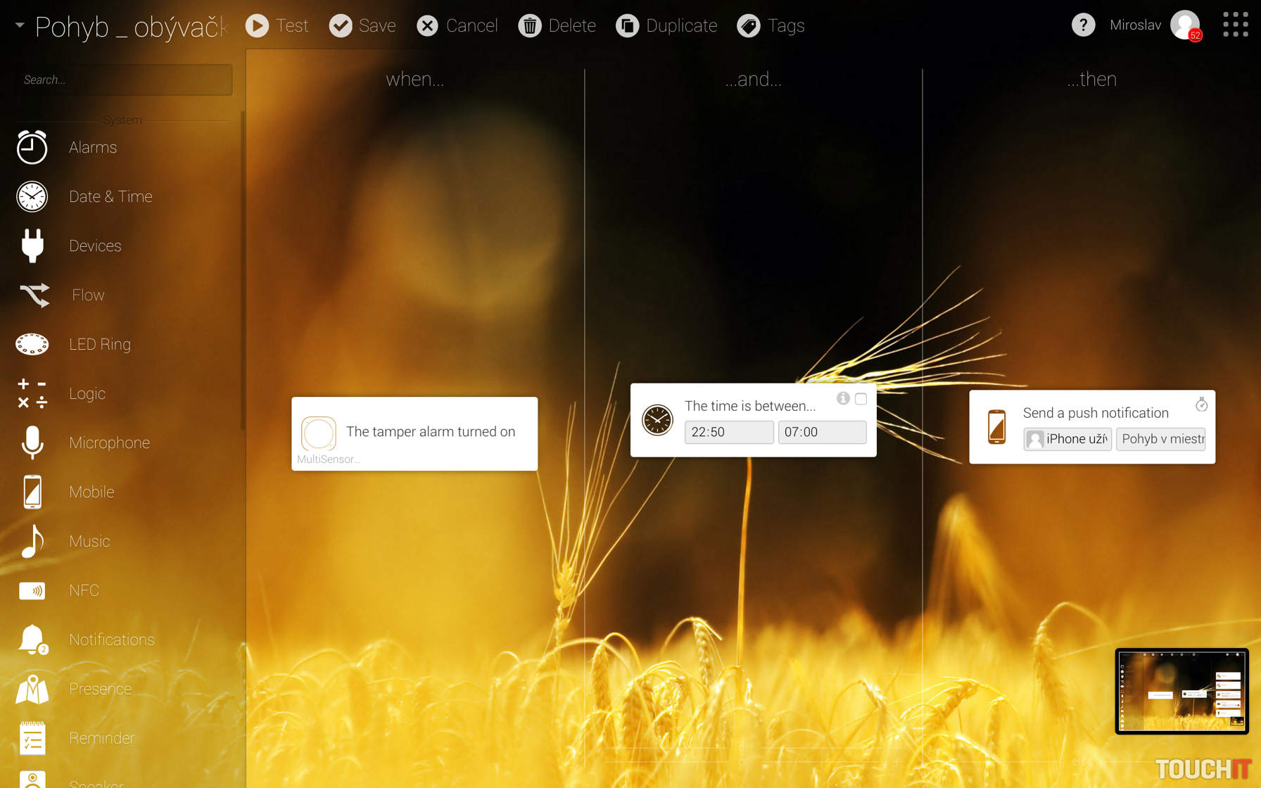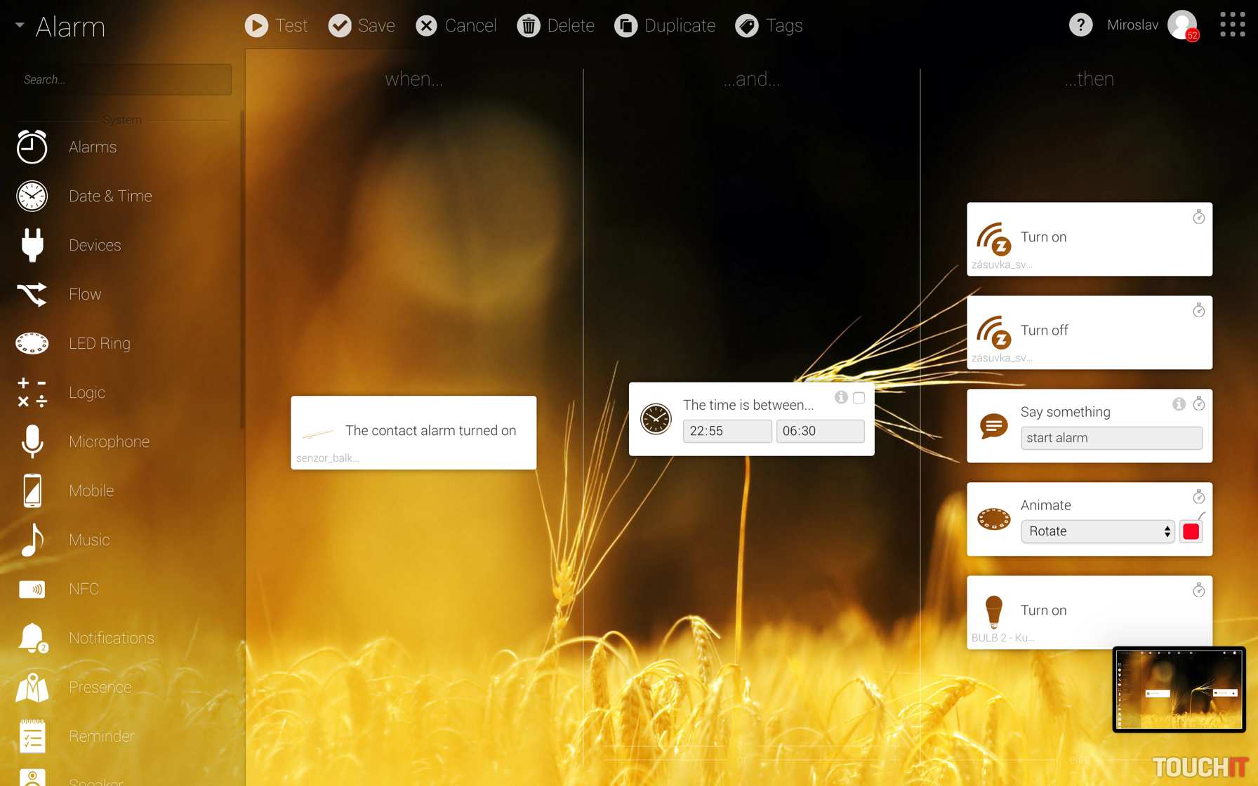 „Ráno sa vytiahnu žalúzie, s východom slnka sa zapne príjemné teplé svetlo, iba v zime a začne sa príprava kávy atď. Možností je nespočetne veľa. Výborná scéna, ktorú radi používame je „odchod z domu“. Po opustení domu/bytu spustíme túto scénu (alebo sa spustí po zistení neprítomnosti sama), pričom sa všetky nepotrebné spotrebiče vypnú, zníži sa kúrenie a ak sa niekde svieti, tak systém tieto svetlá vypne. Taktiež už počas cesty domov aplikácia sleduje vašu polohu, pričom sa pred návratom spustí kúrenie, svetlá a pod. To je fajn, nie?“