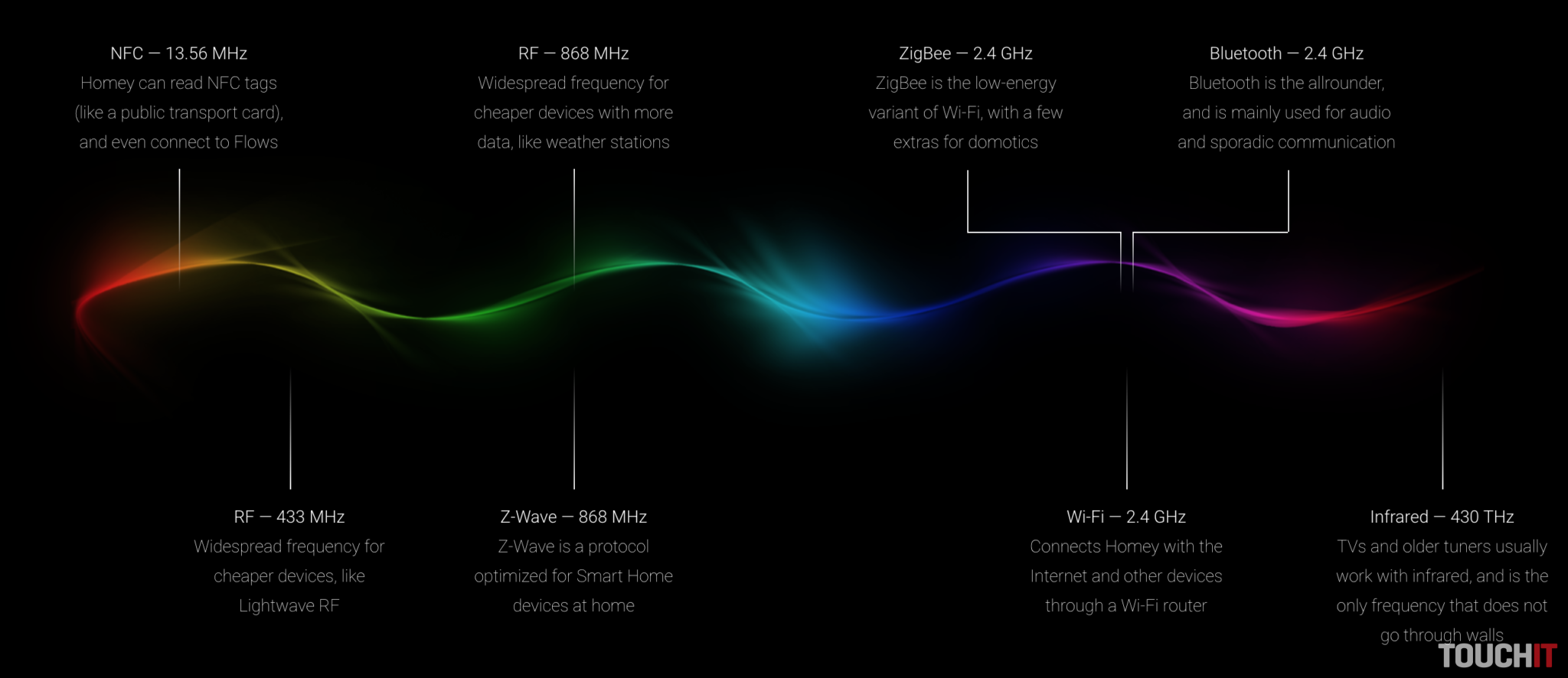 „Základným pilierom, na ktorom Homey stavia je, že dokáže komunikovať s rôznymi bezdrôtovými protokolmi a spojiť tak skutočne odlišné zariadenia do jedného celku a donútiť ich, aby medzi sebou komunikovali tak, ako by ich jedna mater mala. A v skutočnosti to tak je. Homey si rozumie so – Z-Wave, Zigbee, Wi-Fi, Bluetooth LE, 433MHz, 868MHz, IR a NFC. Verte, viac potrebovať nebudete.“