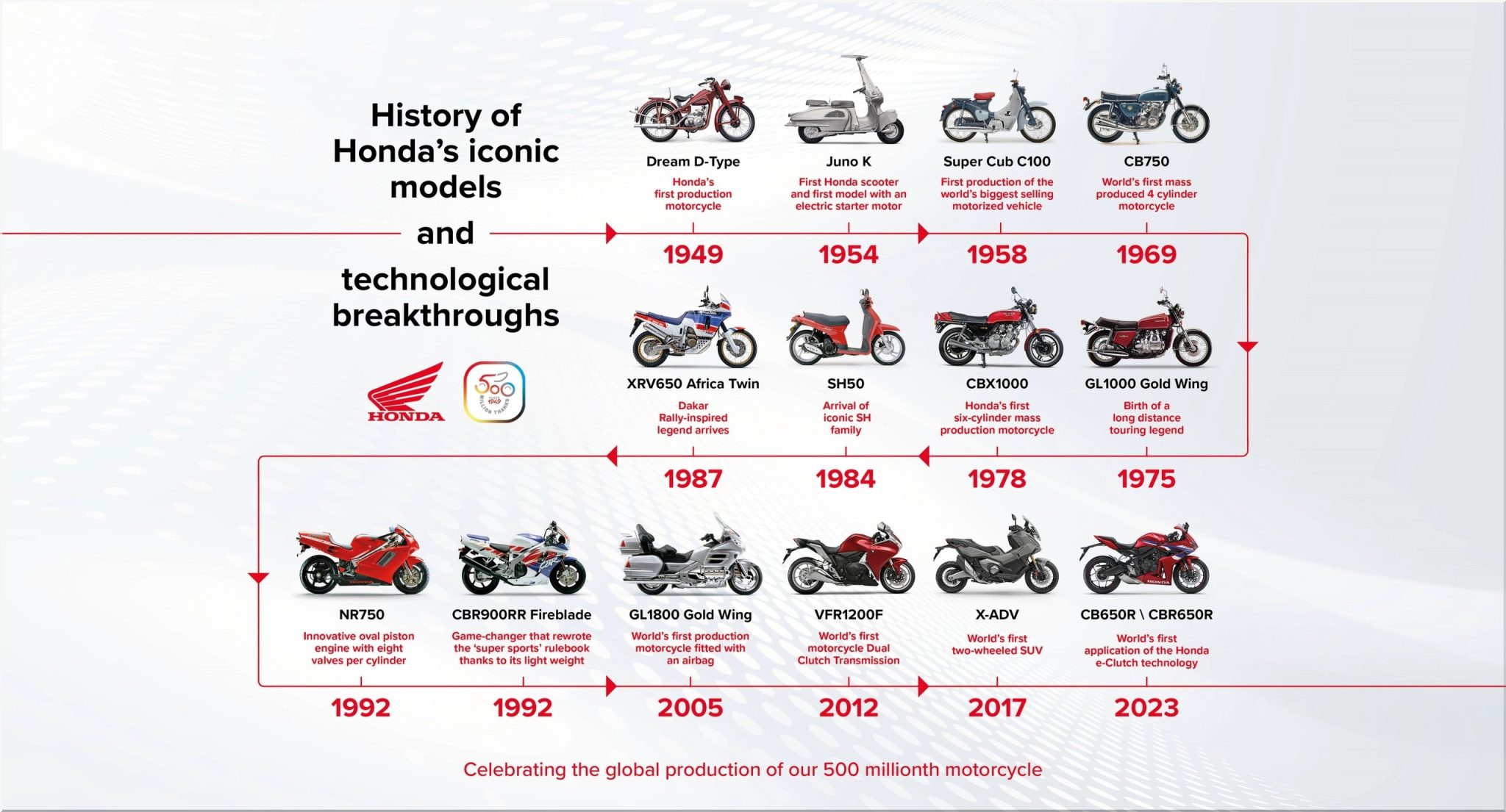 V priemere to predstavuje ohromujúcich 6 578 947 motocyklov ročne – od roku 1949. Honda je jednoznačne nezastaviteľným strojom na výrobu motocyklov, ktoré celý svet miluje. Avšak, na čísle 500 miliónov je zaujímavé najmä to, ako dlho trvalo, kým Honda dosiahla prvých 100 miliónov a ako následne relatívne rýchlo pokorila hranicu 500 miliónov predaných kusov.