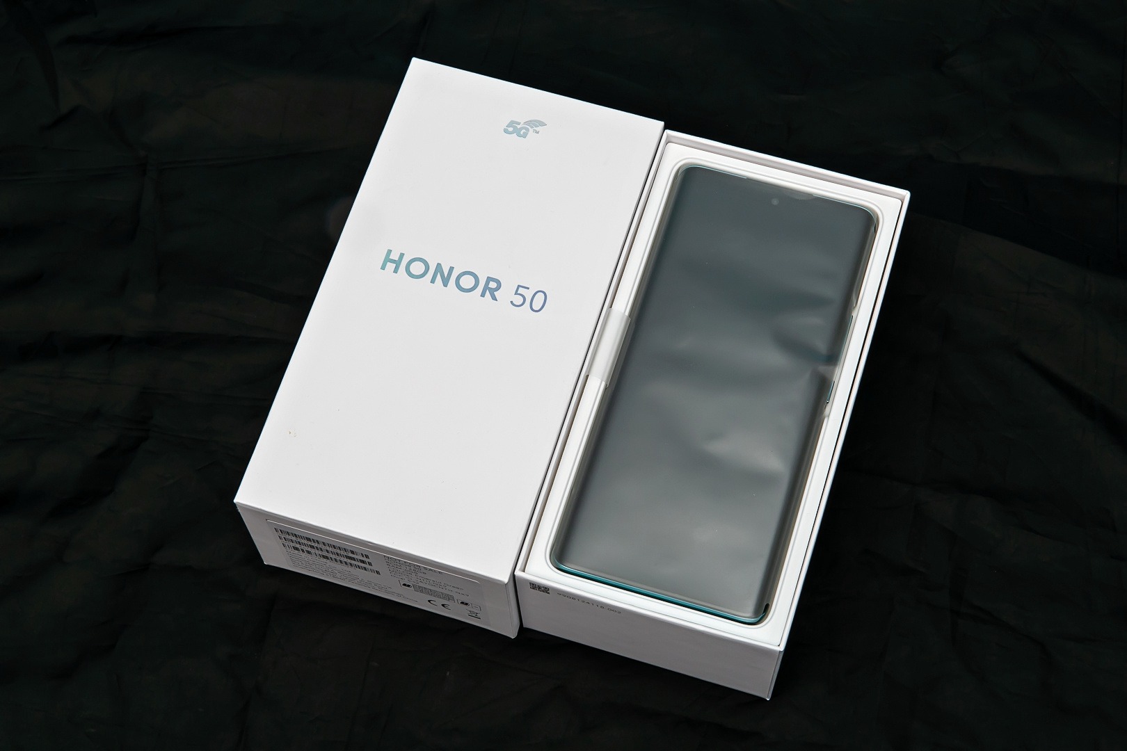 Telefón HONOR 50 prichádza v bielej krabičke so striebornými písmenami. Okrem názvu telefónu je tu pomerne jasne zvýraznené, že ide o 5G telefón. Na štítku na spodnej časti je uvedená pamäťová verzia. Na test sme dostali model so 6 GB RAM a 128 GB pamäte pre používateľa. Farebnú verziu máme Emerald Gold, v preklade je to zelená.