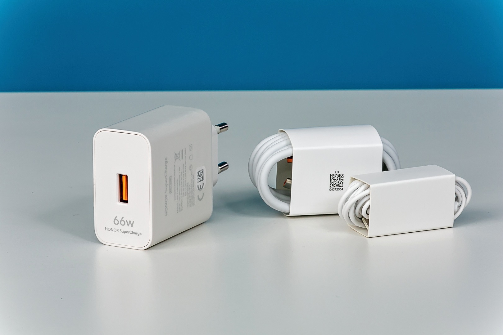 Celkom v spodnej časti sa nachádza príslušenstvo, ktoré je v tomto prípade kompletné. Teda napájací zdroj HONOR SuperCharge s výkonom 66 W, ďalej prepojovací kábel USB-C a tiež slúchadlá s USB-C pripojením. S týmto zdrojom sme naozaj telefón nabili za 20 minút na takmer 70 %.