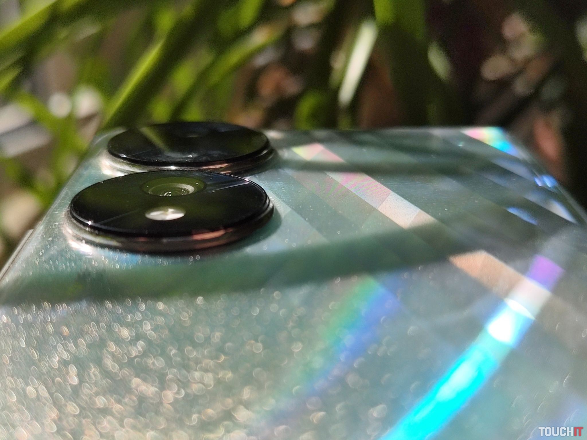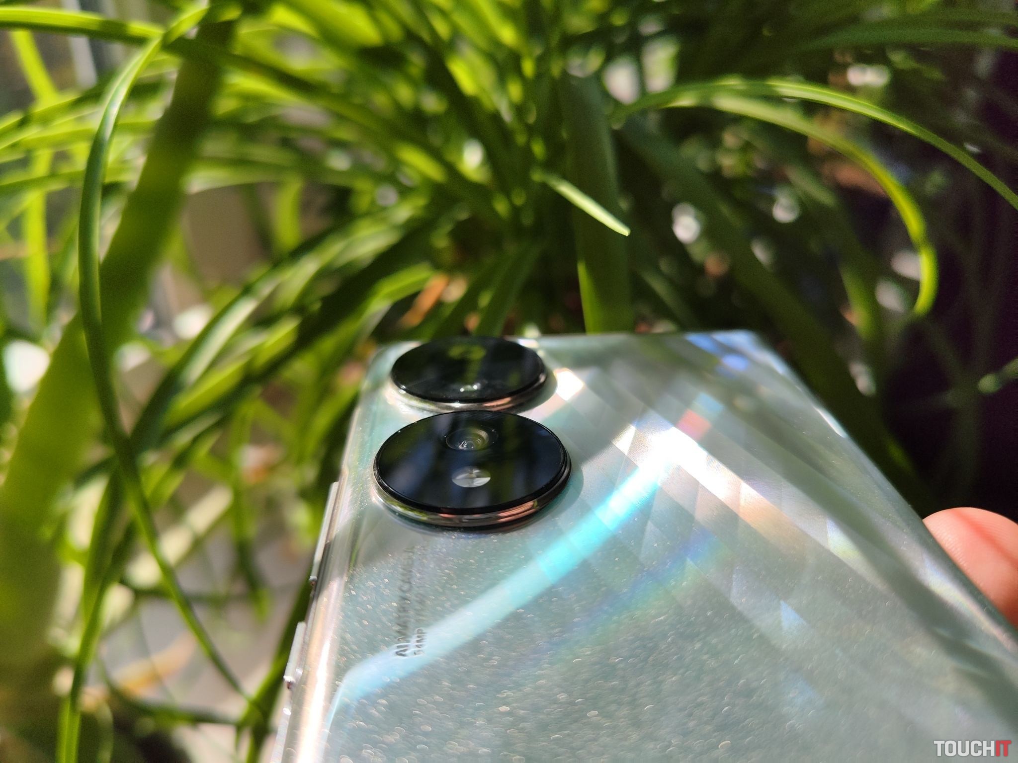 Zadná strana s kosoštvorcovým efektom vytvára odlesky podľa uhla naklonenia telefónu. Vyzerá to dobre a je to opäť iná forma spracovania tak, aby ste videli niečo nové. Zároveň je to jeden z hlavných ukazovateľov ako rozlíšiť telefón od ostatných. Najdôležitejším prvkom sú ale fotoaparáty vo vystúpených prstencoch.
