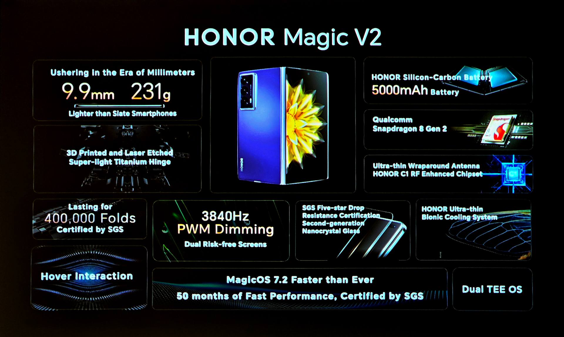 HONOR Magic V2, vyvinutý počas dvoch rokov, obsahuje viac ako 210 technologických inovácií, kľúčom je ultratenká batéria, chladiaci systém, pánt a pod. Zaujme aj displej. HONOR Magic V2 je tak najtenší skladací smartfón, aký kedy HONOR predstavil. Váži len 231 gramov a v zloženom stave meria len 9,9 mm. Je vybavený novou generáciou duálnych kremíkovo-uhlíkových batérií s priemernou hrúbkou iba 2,72 mm, ktorá dosahuje celkovú kapacitu 5 000 mAh.