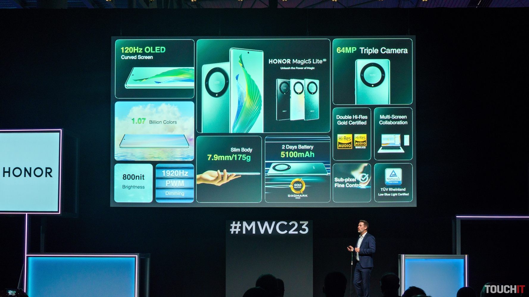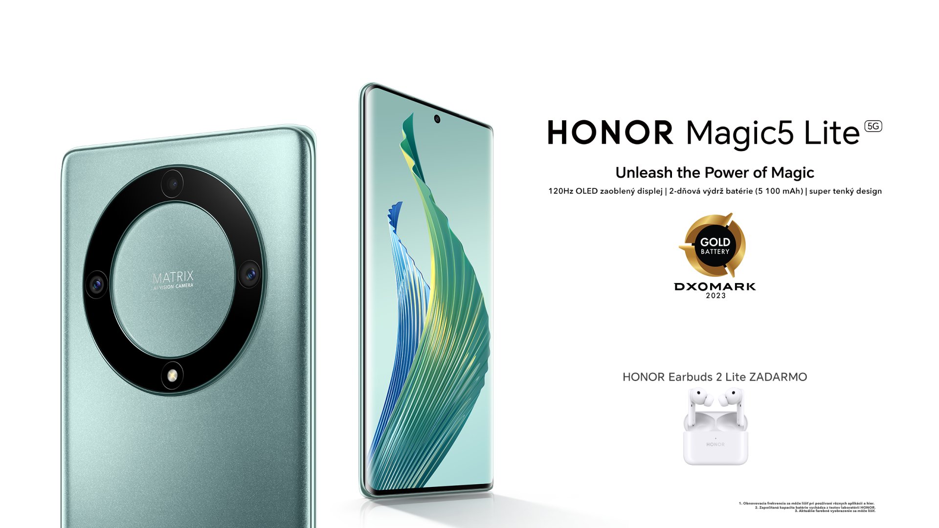 Telefón sme si pozreli na MWC 2023 a ide o odolný a tenký mobil, ktorý vydrží bez nabitia až 3 dni. Takúto výdrž potvrdil aj rebríček DxOMark, ktorý HONOR Magic5 Lite vyhodnotil ako telefón s najlepšou batériou na svete so skóre 152 bodov. Model má zároveň štíhle telo, ktorému dominuje na prednej strane zaoblený 120 Hz OLED displej. Na Slovensku ho kúpite za 379 eur, navyše bezdrôtové slúchadlá HONOR Earbuds 2 Lite sú k tomuto telefónu ako darček.