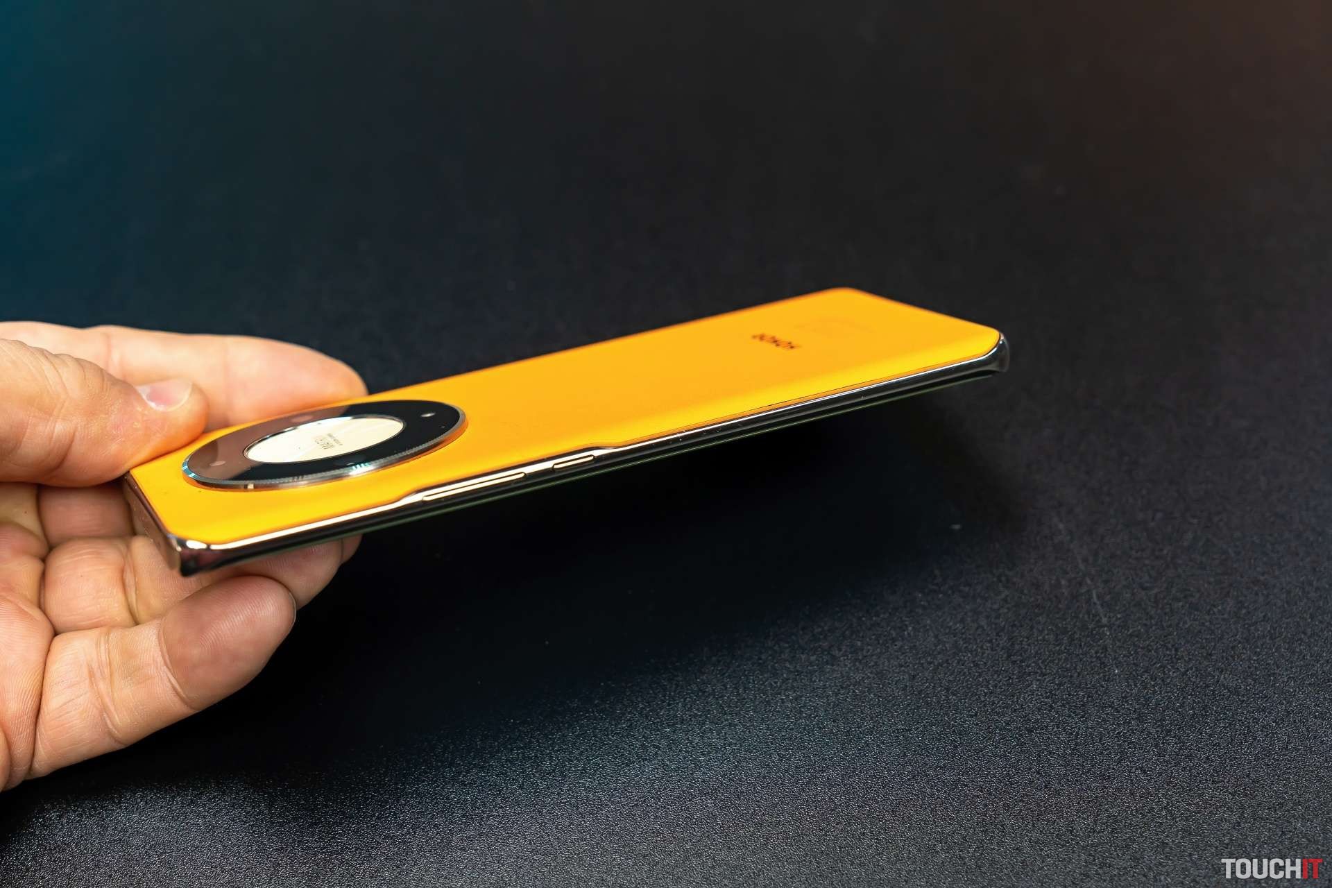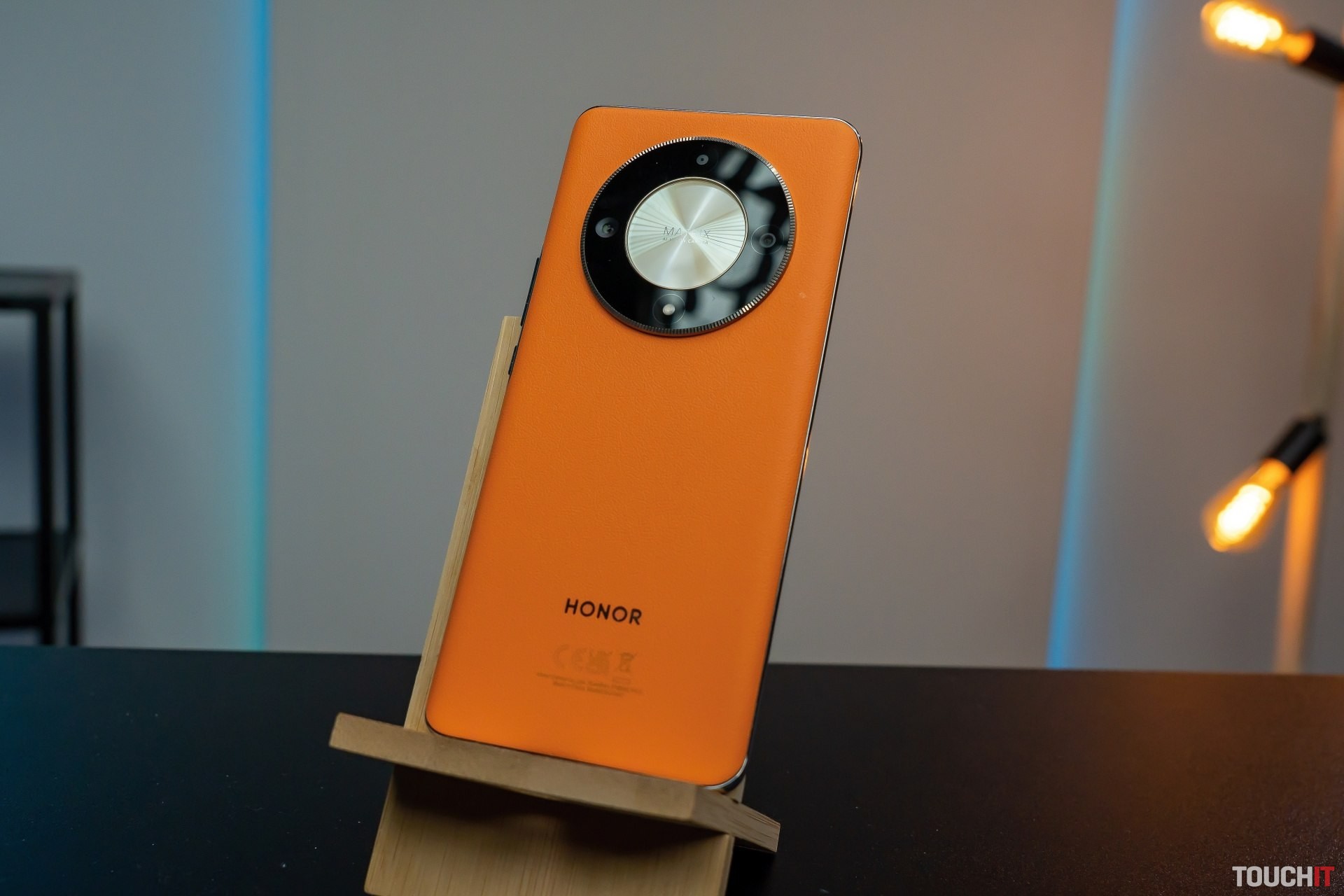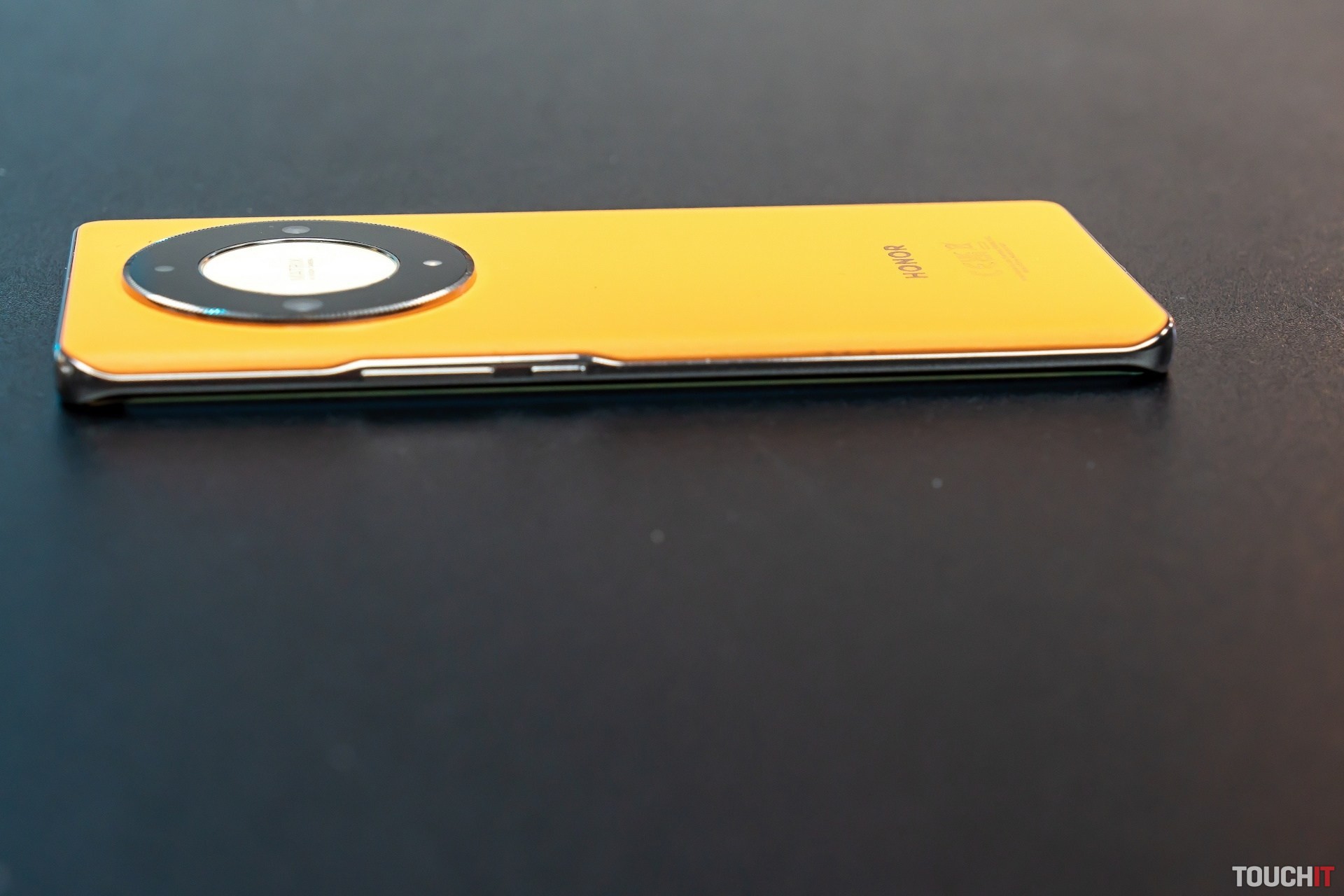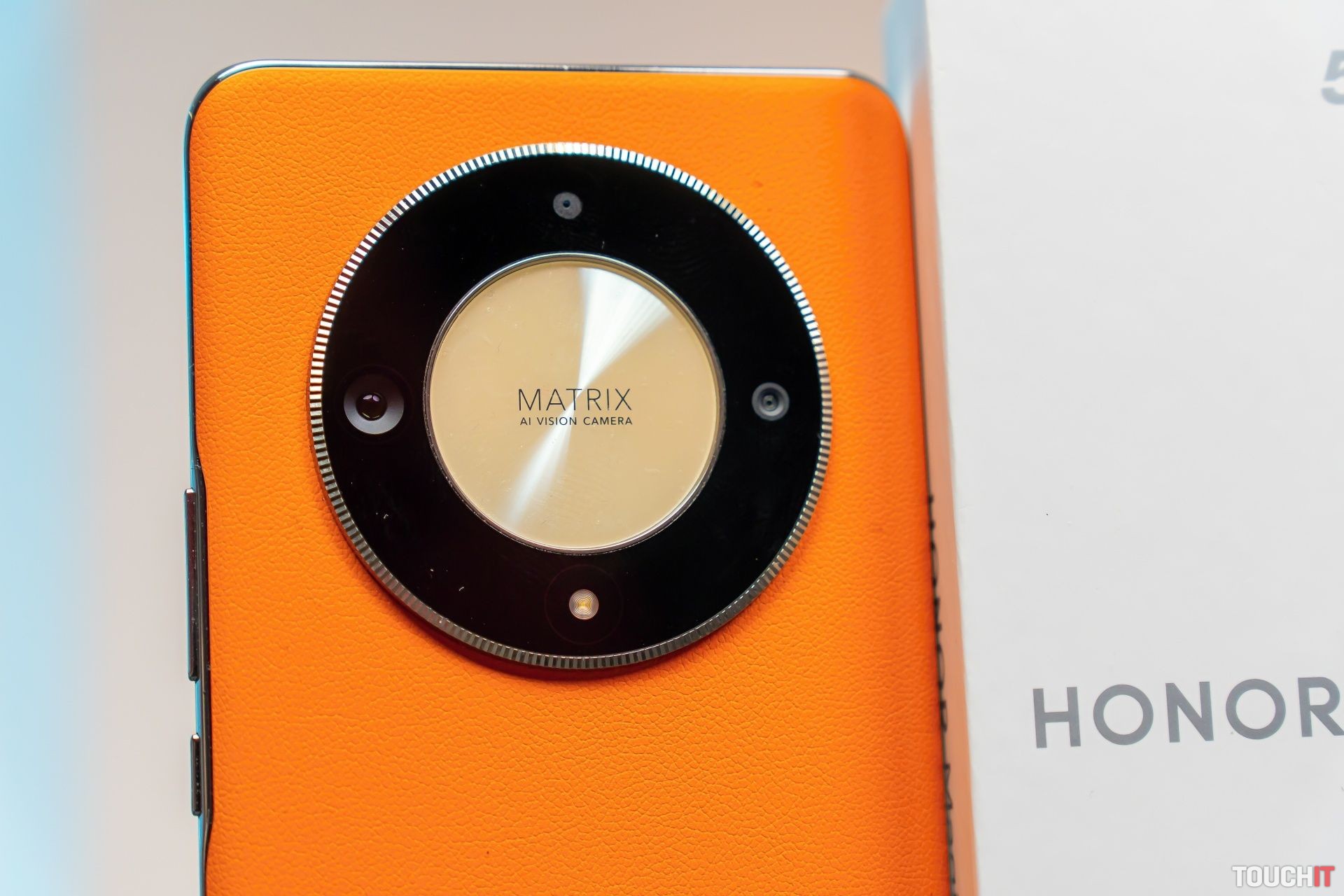 Mali sme oranžovú verziu a ide o imitáciu kože, kde odtlačky prstov nemajú šancu na presadenie sa. V hornej časti zadnej strany je je pre Honor typické kruhové uloženie fotoaparátov. Je tu trojkombinácia hlavný, ultraširokouhký a teleobjektív. Rozlíšenie fotoaparátov si vyžaduje dlhší popis.