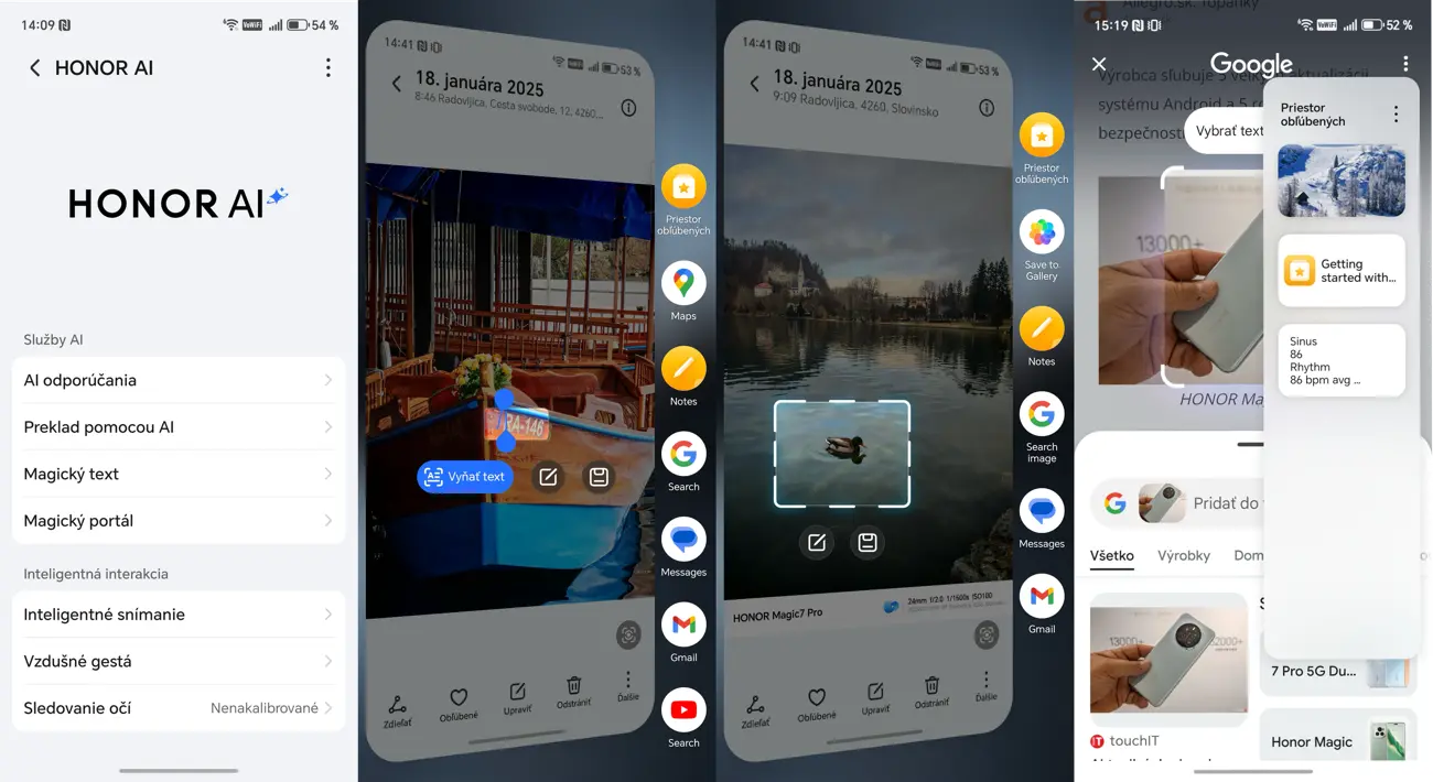 HONOR Magic7 Pro obsahuje viacero AI funkcií. Na stredných fotkách je označovanie výrezu a textu pomocou hánky (Magický portál). Vpravo je Circle to Search od Googlu a zobrazená funkcia Priestor obľúbených