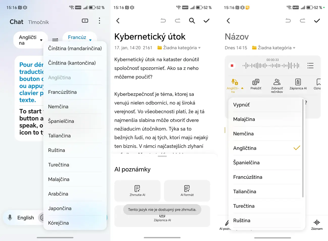 V aplikácii Poznámky nájdete aj funkciu diktafónu, ktorý pomocou umelej inteligencie dokáže generovať prepis hovoreného slova a prípadne aj preklad. Slovenčina nie je podporovaná. Táto funkcia patrí do rovnakej kategórie ako AI prekladač, čiže, podporu slovenčiny som ani nečakal.