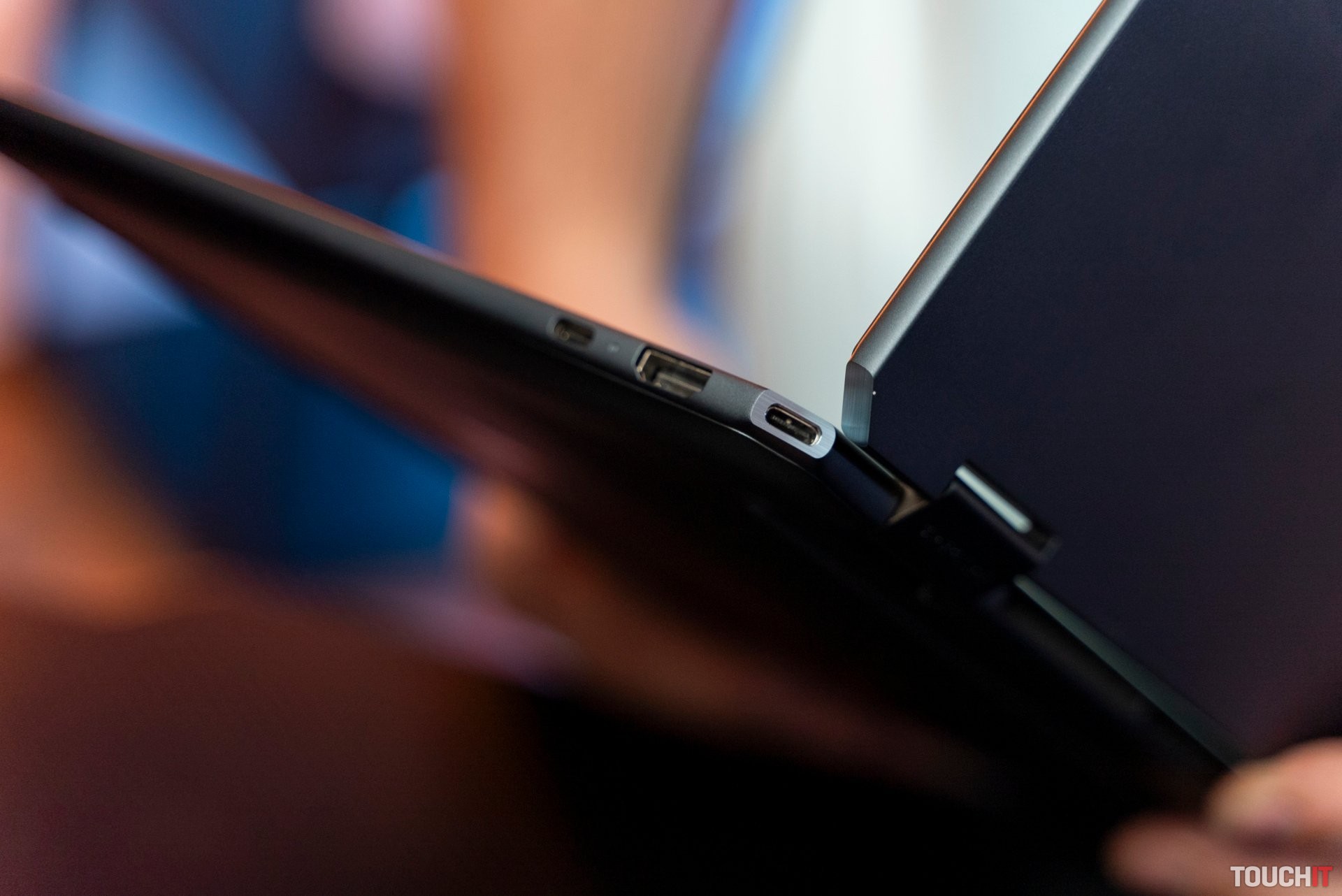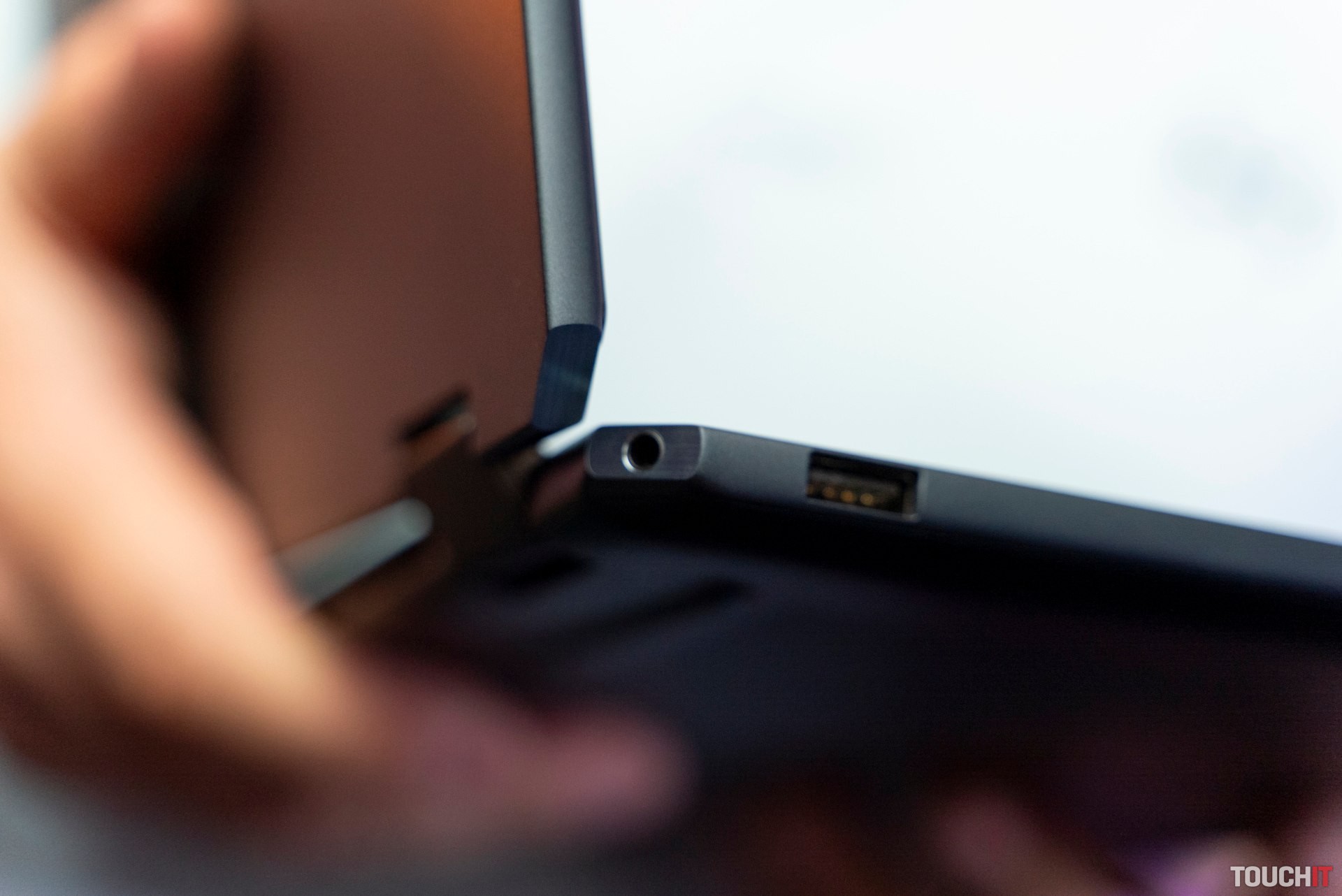 Z hľadiska fyzických portov je tu USB-C s Thunderbolt, ďalej USB 3.2, HDMI 2.1, 3,5 mm jack port a čítačka pre microSD karty. Notebook má zaujímavý dizajn, na okrajoch sú zrazené hrany a prepojovacie porty sa nachádzajú práve v jeho hranách.