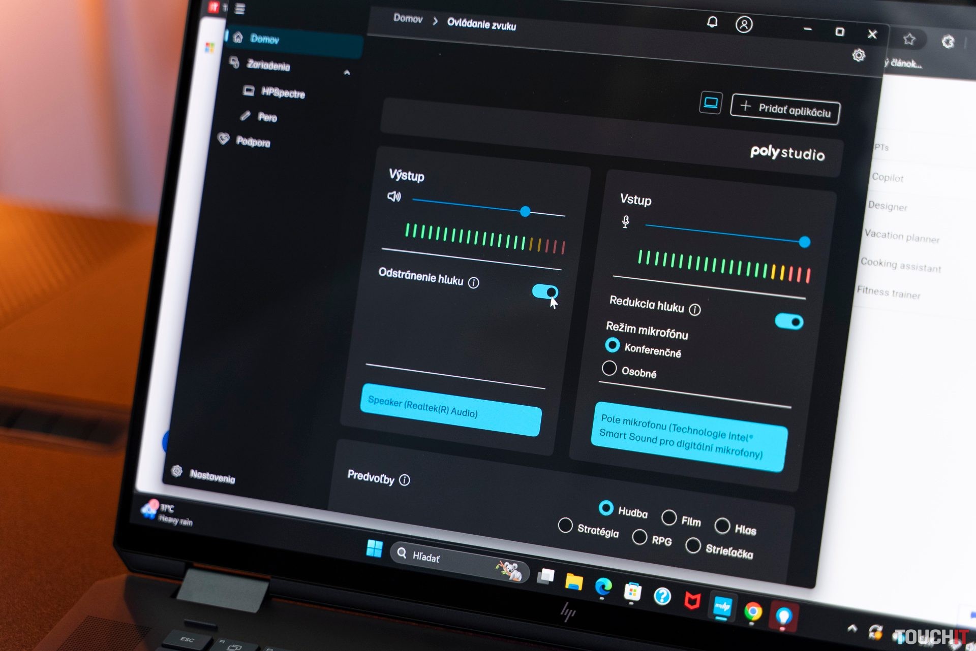 Veľmi sa nám páčil veľký touchpad v spodnej časti so zreteľnou haptickou odozvou – realizovaný klik naozaj cítite v ruke a môžete notebook ovládať aj gestami, touchpad má špeciálne plochy na nastavenie hlasitosti a jasu. Ďalej je tu podsvietená klávesnica, čítačka odtlačkov prstov je integrovaná v zapínacom tlačidle a súčasťou dodávky je aj dotykové pero. Zvuk podporuje DTS:X Ultra a je výborný zvuk. Tvoria ho do hore smerujúce tweetery, ďalej dopredu smerujúce reproduktory s basovou zložkou. Audio je vytvorené v spolupráci s Poly Studio.