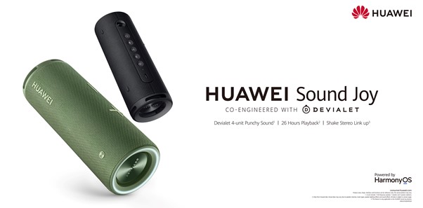 HUAWEI Sound Joy je prvý prenosný reproduktor Huawei, ktorý bol navrhnutý spoločne s legendárnou spoločnosťou Devialet a vďaka systému štyroch reproduktorových jednotiek prináša výbornú kvalitu zvuku. Vďaka 8800 mAh batérii ponúka dlhú výdrž, čo znamená 26 hodín nepretržitého prehrávania na jedno nabitie. Dodáva sa s odolnosťou voči vode a prachu na úrovni IP67. V predaji je v dvoch farbách – obsidiánovo čiernej a smrekovo zelenej.