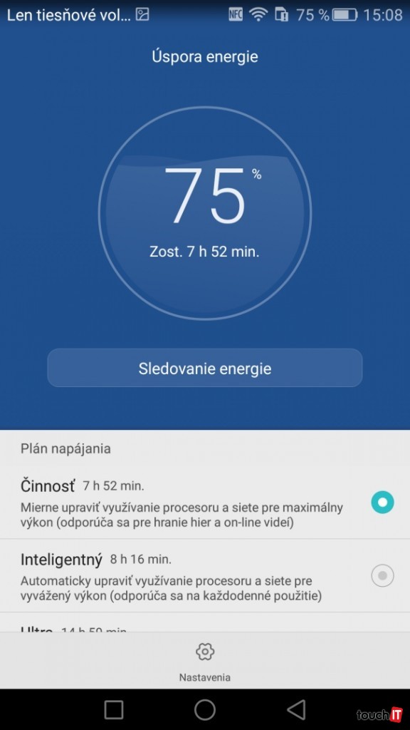 Prekvapením pre nás bola na pohľad nízka kapacita akumulátora. Telefóny za tretinovú cenu majú 4000 mAh, tento mal iba 2700 mAh. Je to však len „papierový“ údaj, reálne sa toho netreba obávať. Jednak telefón naozaj vydrží celý deň vyššieho zaťaženia, ak cestujete, prepnete si ho do režimu úspory. Huawei totiž aktualizoval zhruba pred mesiacom svoje rozhranie a pridal funkciu úspory pri vypnutom displeji. Kto chce ísť s úsporou ešte ďalej, má možnosť zapnúť režim Ultra. Budete mať vo vrecku štandardný telefón bez ďalšej funkcionality, no vydržíte s ním niekoľko dní. My tento režim využívame na cestách, kde nepotrebujeme smartfón a potrebujeme mať nabitý telefón s možnosťou volania a SMS.