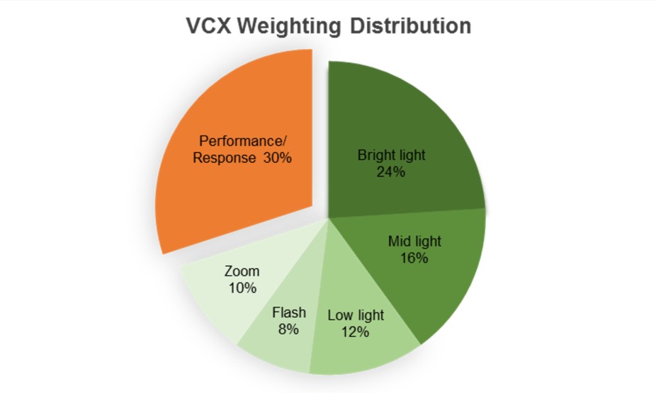Hodnotiace skóre VCX je váženým priemerom hodnoty, ktorá zohľadňuje 2 kategórie parametrov na škále od 0 po 100: (1) kvalitu obrazu a (2) odozvu a výkon zariadenia. Prvý menovaný parameter predstavuje hodnotenie kvality obrazového výstupu a tvorcovia rebríčka mu pridelili 70-percentnú váhu. Testuje sa na snímaní štandardizovaného testovacieho diagramu T42 v piatich preddefinovaných situáciách: