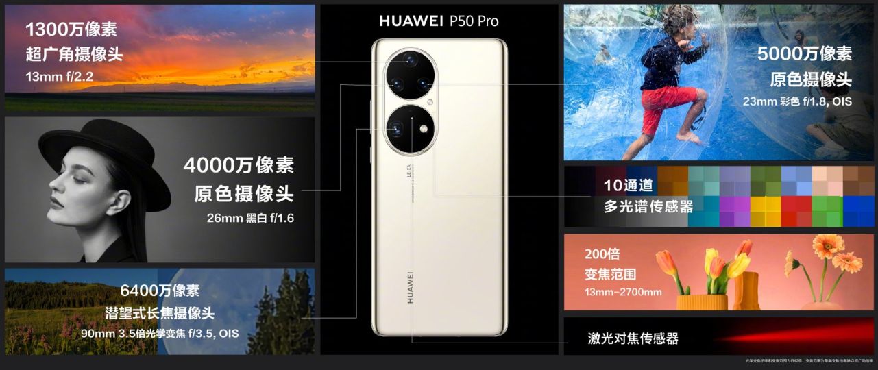 Huawei P50 aj P50 Pro ponúkajú 10-kanálové farebné senzory a vylepšené teleobjektívy. Základom oboch telefónov je 50 Mpx hlavný senzor (23 mm) s clonou f/1.8 a optickou stabilizáciou v prípade modelu P50 Pro. Ten dostal do výbavy aj čierno-biely senzor (26 mm), ktorý Huawei používal už v minulosti. Vo verzii pre P50 Pro ponúka rozlíšenie 40 Mpx a má clonu f/1.6.