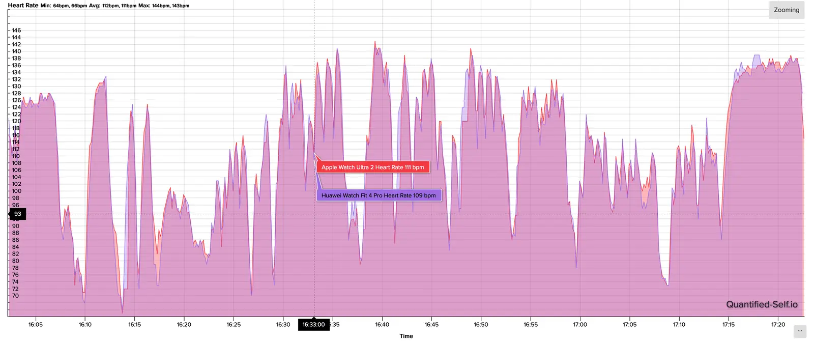Pochvalu si zaslúži aj dvojpásmový GPS čip. Huawei Watch Fit 4 Pro som porovnával s Apple Watch Ultra 2 a presnosť merania bola prakticky identická, samozrejme s určitými odchýlkami, ktoré sú dané tým, že jedny hodinky boli na pravej ruke a druhé hodinky boli na ľavej ruke. V porovnaní s minuloročnými Huawei Watch Fit 3 však ide o citeľný posun presnosti k lepšiemu.