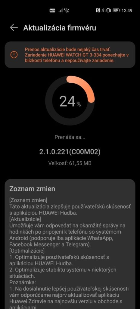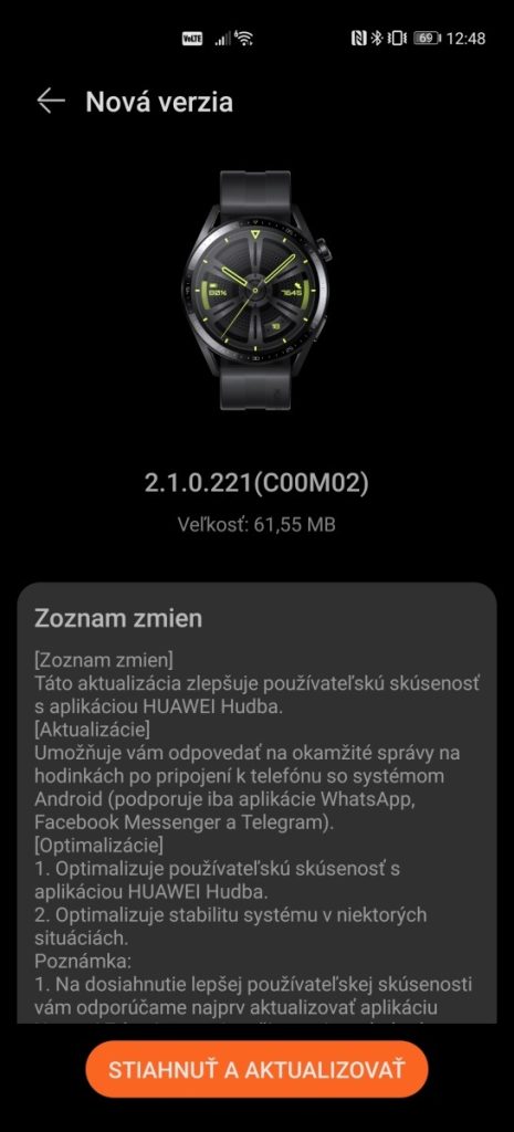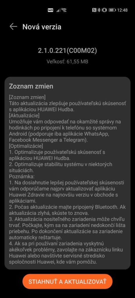 Po pár dňoch konečne dorazila aj na Slovensko a prináša malé, ale za to očakávané vylepšenia. Aktualizačný balík 2.1.0.221 (COOM02) s veľkosťou 61,55 MB prináša zlepšenie, ktoré používateľom umožní odpovedať aj na prijaté správy z aplikácií WhatsApp, Messenger a aj Telegram. Okrem toho aktualizácia prináša lepšiu interakciu s aplikáciou Huawei Hudba a zvyšuje aj stabilitu zariadenia.