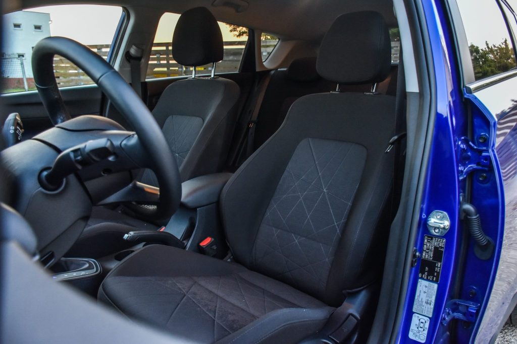 Všetky ovládacie prvky majú dobrú polohu, čo zaručuje veľmi rýchle prepojenie medzi vodičom a autom – po pár dňoch budete väčšine vecí ovládať po pamäti. Látkové sedadlá majú zaujímavý vzor + sú vyhrievané a teplomilných ľudí poteší aj vyhrievaný a pekne tvarovaný volant.