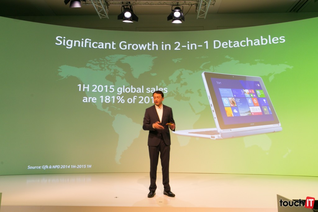 Tlačovú konferenciu uvádzal Jason Chen, CEO spoločnosti Acer a hovoril o ekonomických úspechoch tejto firmy. Veľmi sa darilo hlavne predaju zariadení typu 2 v 1.