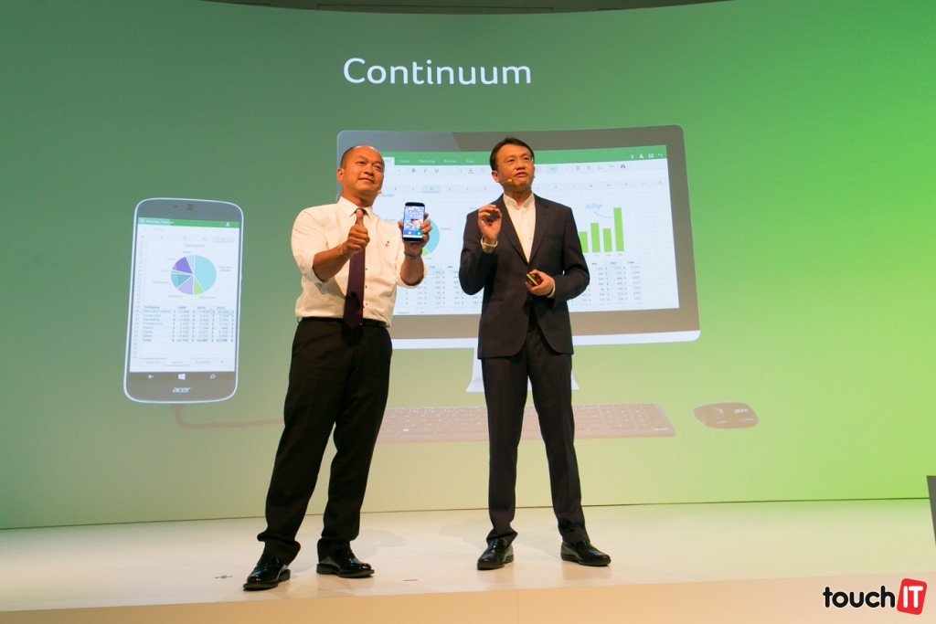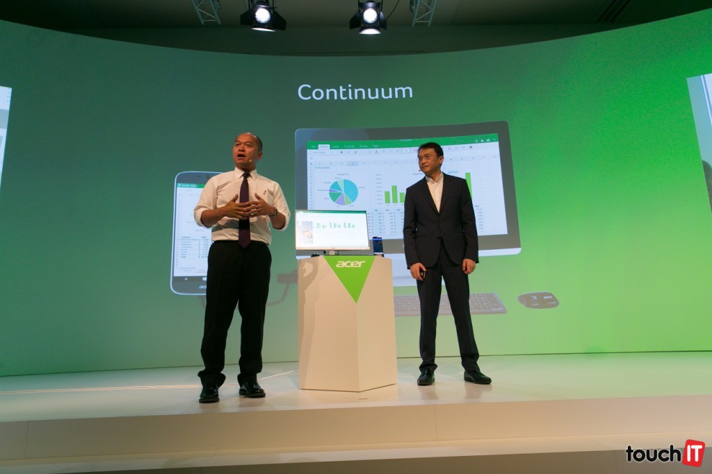 Acer ako prvý predstavil aj smartfón s operačným systémom Windows 10 a predviedol, čo to vlastne znamená Continuum. Môžete pracovať v práci napr. s tabluľkami v Exceli a po skončení práce si zobrať počítač-telefón so sebou do vrecka. Údaje máte kedykoľvek k dispozícii.