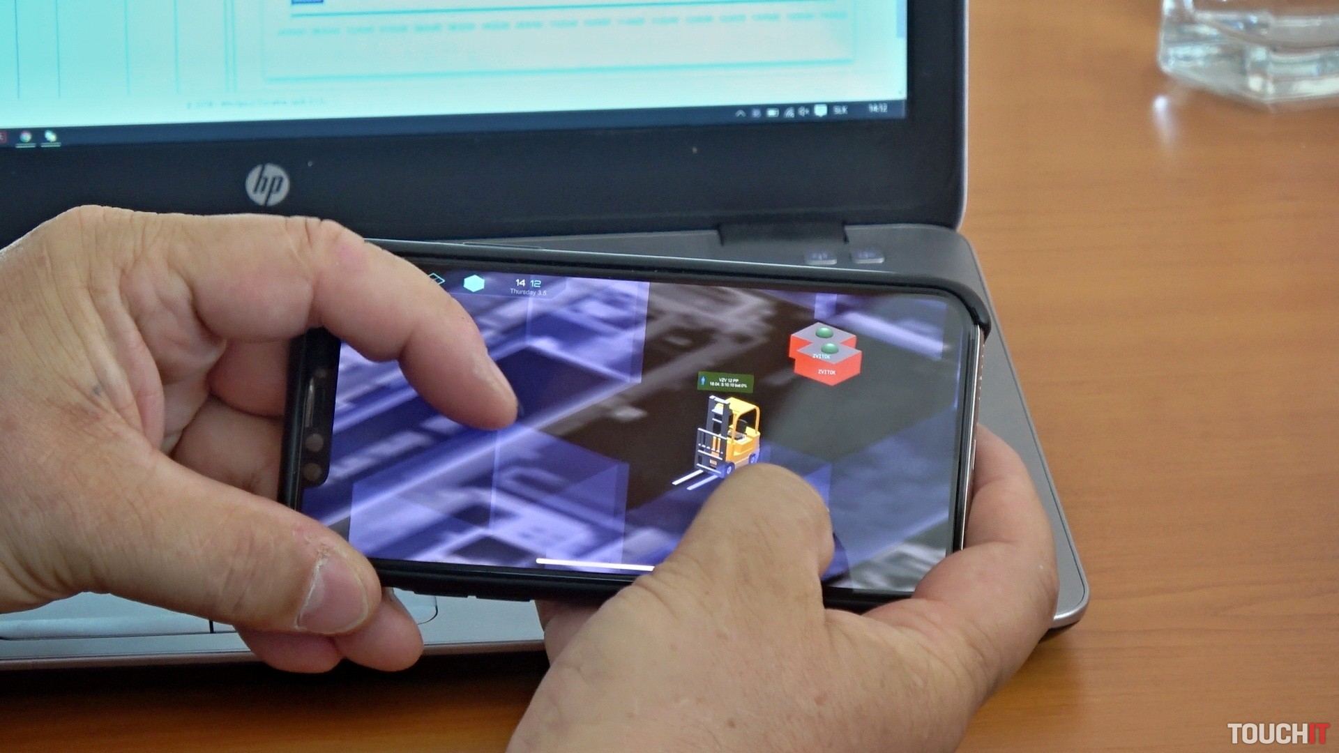 Pán Ukropec nám ukázal aj platformovo nezávislú aplikáciu do mobilného telefónu, ktorá ukazuje dopravu tovaru po celom podniku v reálnom čase. V aplikácii vidíte napr. žlté vozíky a spomínané červené tlačidlá pre procesy, ktoré sa nedajú jednoducho monitorovať. Potlačenie tlačidla operátorom potom vo vhodnom čase privolá vozíček. Túto aplikáciu považujeme za čerešničku na torte zavedeného systému Industry 4.0 v Poprade.