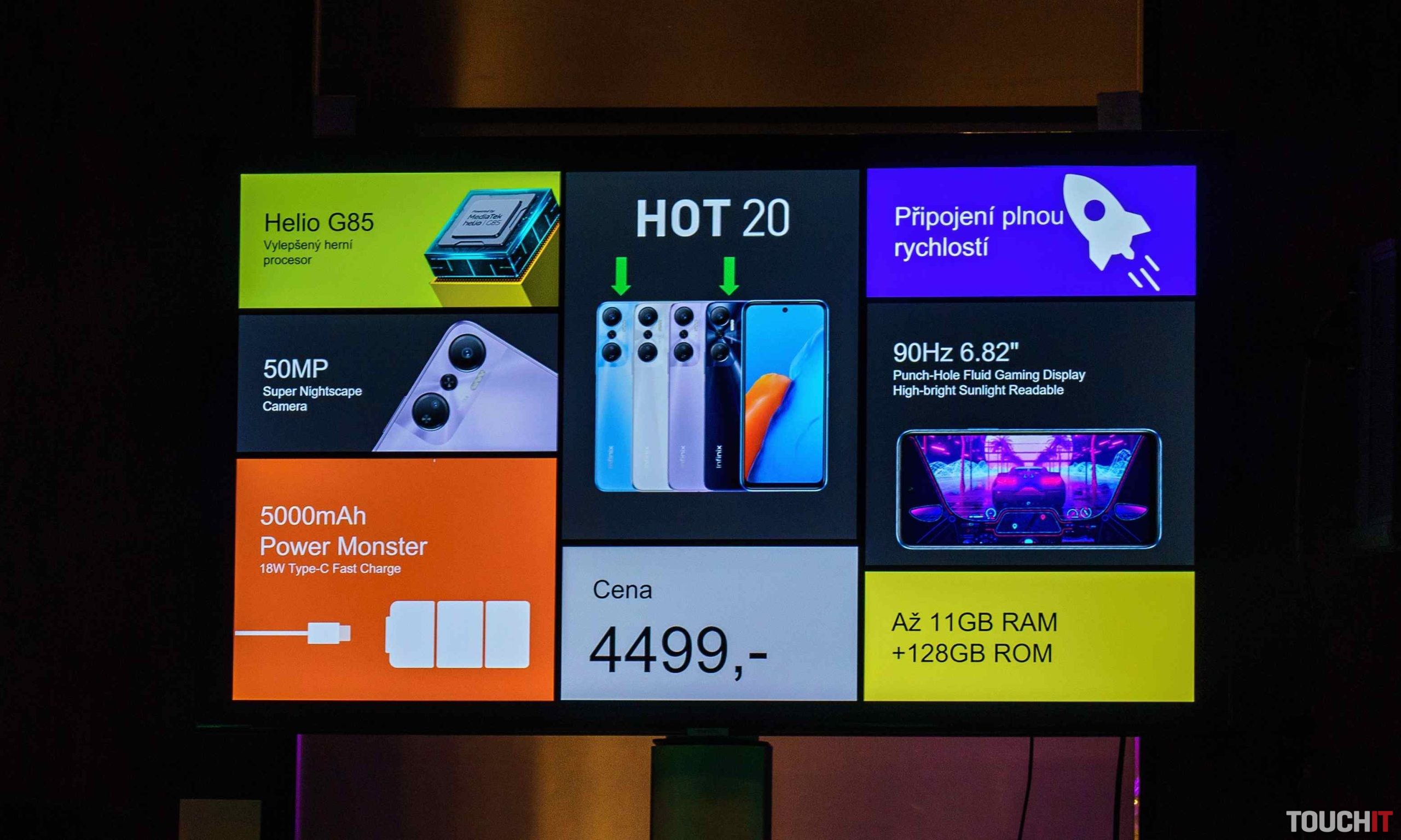 Smartfón HOT 20 5G je k dispozícii vo verzii so 4/128 GB RAM s možnosťou rozšírenia RAM na 7 GB a HOT 20 NFC vo verzii so 6/128 GB s možnosťou rozšírenia RAM o ďalších 5 GB na 11 GB. Pomocou karty micro SD môžete úložisko telefónu zväčšiť až na 1 TB. HOT 20 5G má 6,6-palcový displej a 50 Mpx zadný fotoaparát s duálnym bleskom a procesorom MediaTek Dimensity 810. Cena HOT 20 5G je 181 eur a je to tak telefón v cene pod 200 eur, ktorý prináša podporu 5G.