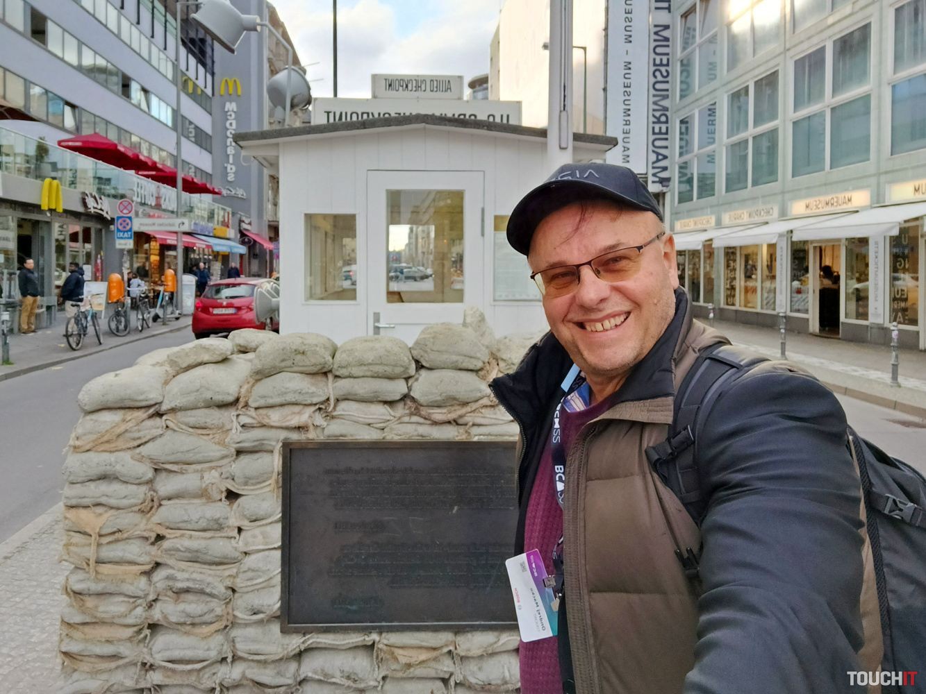 Prirodzene, vyskúšali sme aj selfie kameru a s ňou sme sa fotili pre zmenu v Berlíne na známom Check Point Charlie. Telefón sme držali v ruke a použili oneskorenie spúšte.