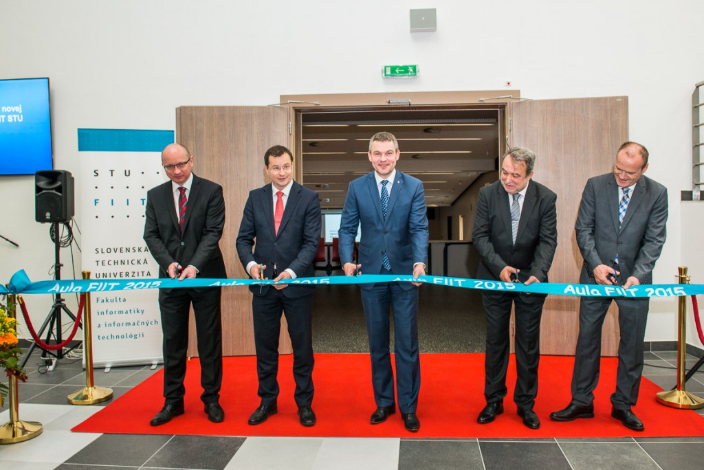 Zľava: Robert Redhammer, rektor STU, Juraj Draxler, minister skolstva SR, Peter Pellegrini, predseda NR SR, Pavel Čičák, končiaci dekan FIIT STU, Peter Olejár, spol. Hiteco, jeden z konzorcia dodávateľov auly