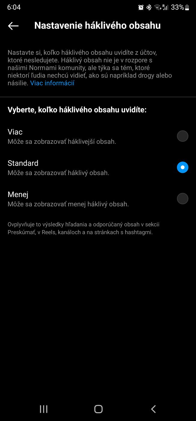 Ak si chcete skontrolovať či zmeniť svoje nastavenia ohľadom háklivého obsahu, stačí ísť v aplikácii Instagram do Nastavení – Účet – Nastavenia háklivého obsahu.