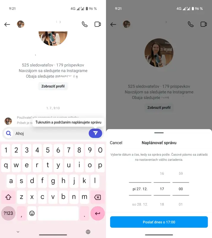 Spôsob, akým môžete naplánovať správy v platforme Instagram, je rovnaký v aplikácii pre Android aj iPhone. Jednoducho otvoríte konverzáciu, v ktorej chcete naplánovať odoslanie správy na neskôr a správu napíšete. Namiesto toho, aby ste však stlačili tlačidlo na jej odoslanie, ho dlhšie podržíte. Zobrazí sa vám tak posuvný panel s možnosťou výberu dátumu a času odoslania správy.