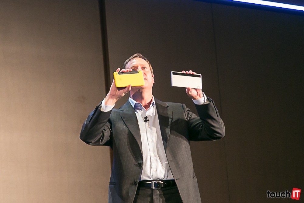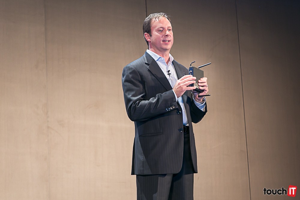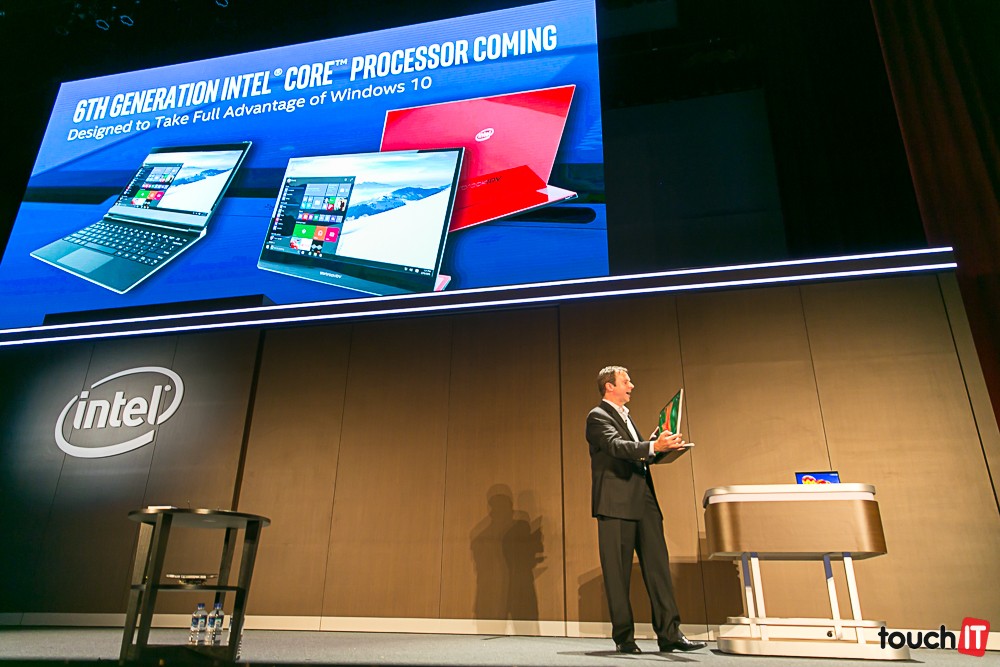 Kirk Skaugen práve ukazuje prototyp zariadenia s procesorom Intel Core šiestej generácie. Je to All-in-One počítač, ktorý je tak tenký ako mobilný telefón. Dokonca sa dá z neho aj telefonovať