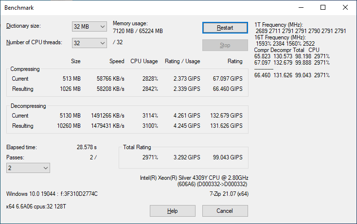 Intel Server Sys M50CYP1UR204 je postavený na architektúre Intel Xeon, konkrétne na modeli Intel Xeon Silver 4309Y. V tomto prípade sú použité dva procesory, čo vo výsledku znamená takmer dvojnásobný výkon v dvojjadrových testoch. Výhodou tohto riešenia je okrem samotného výpočtového výkonu aj fakt, že máte širšie možnosti v definovaní toho, aký výkon na jadro a následne vlákna chcete aplikáciám priradiť.