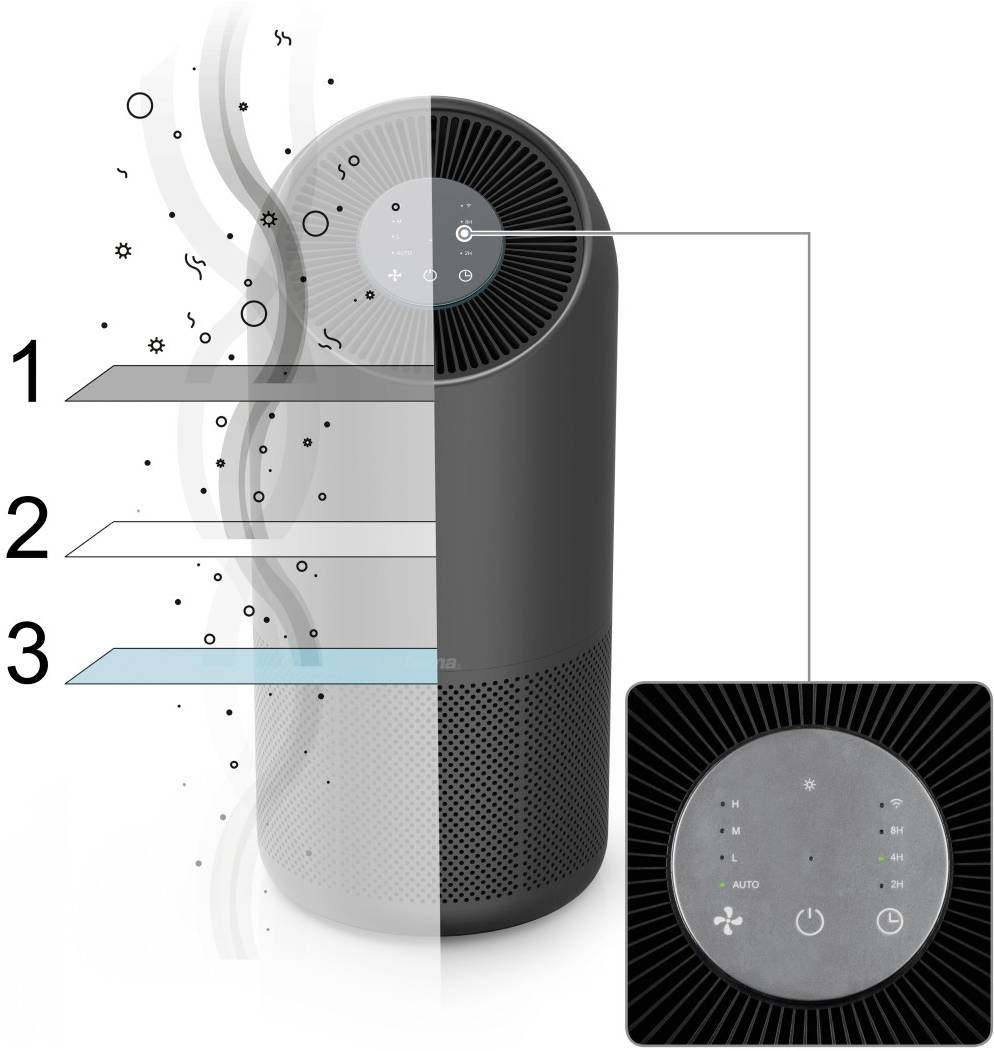 Čistička podporuje všetky základné funkcie ako sú nastavenie rýchlosti, časovač odpočítavania či počítadlo trvanlivosti filtra. Zabudovaný je tiež senzor kvality vzduchu, ktorý rozpoznáva kvalitu vzduchu v miestnosti a prispôsobuje automaticky výkon filtrácie.