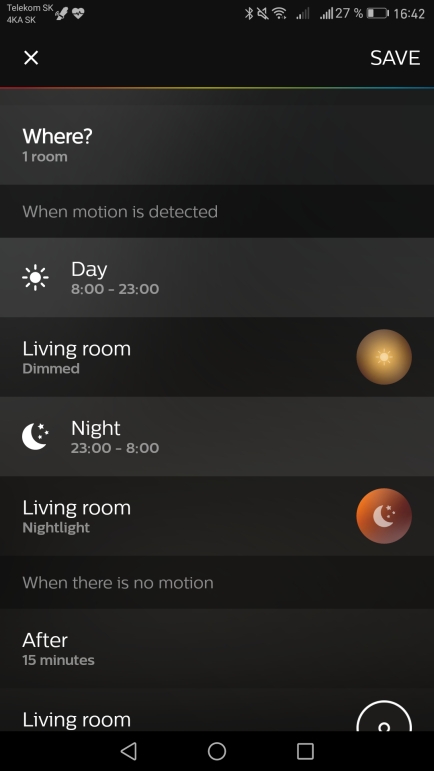 Intenzitu svetla, kedy má pracovať a kedy nie, si môžete nastaviť. Pokiaľ je málo svetla, senzor aktivuje denný alebo nočný režim, ktoré si takisto môžete prispôsobiť. Ide najmä o intenzitu, s akou inteligentné svetlá začnú svietiť. Praktické je, že ak senzor nezaznamená pohyb počas zadanej doby, automaticky vypne svetlá v miestnosti.