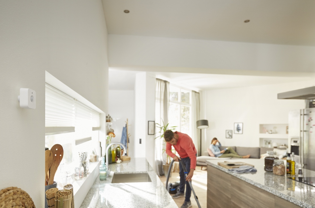 Pohybový senzor Motion Sensor robí presne to, čo očakávate. Dokáže zaznamenať pohyb. Nepošle vám síce upozornenie, ale na základe nastaveného scenára aktivuje svetlá. Pohybový senzor pracuje neustále a je inteligentný – keď zistí, že je v okolí dostatok slnečného svetla, tak neaktivuje žiaden zo scenárov.