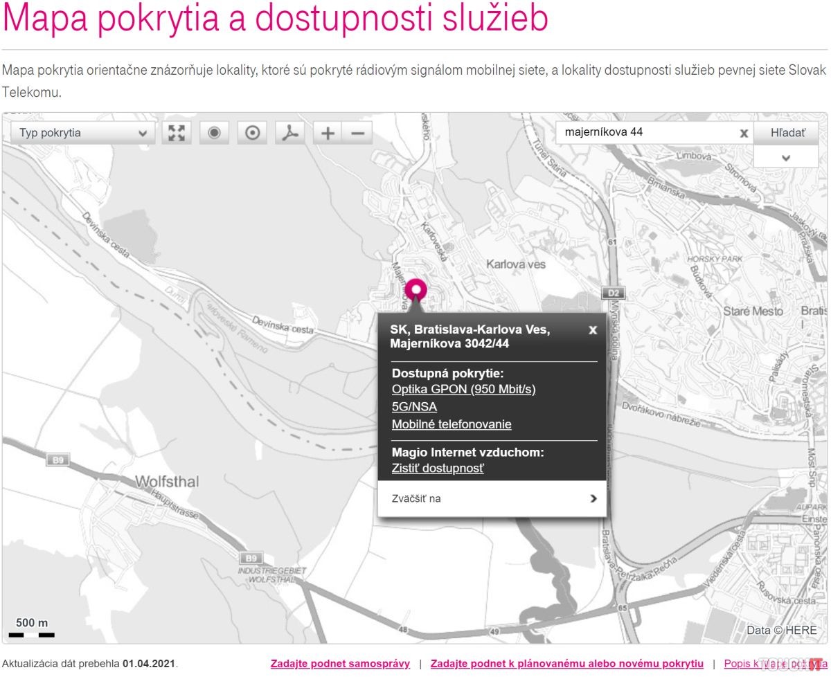 - Ak máte záujem o pevnú službu Telekomu na optickej sieti, skontrolujte si pokrytie na mape na oficiálnom webe Telekomu, TU. Stačí zadať adresu a na mape sa vám objavia detailné informácie o dostupnom pokrytí