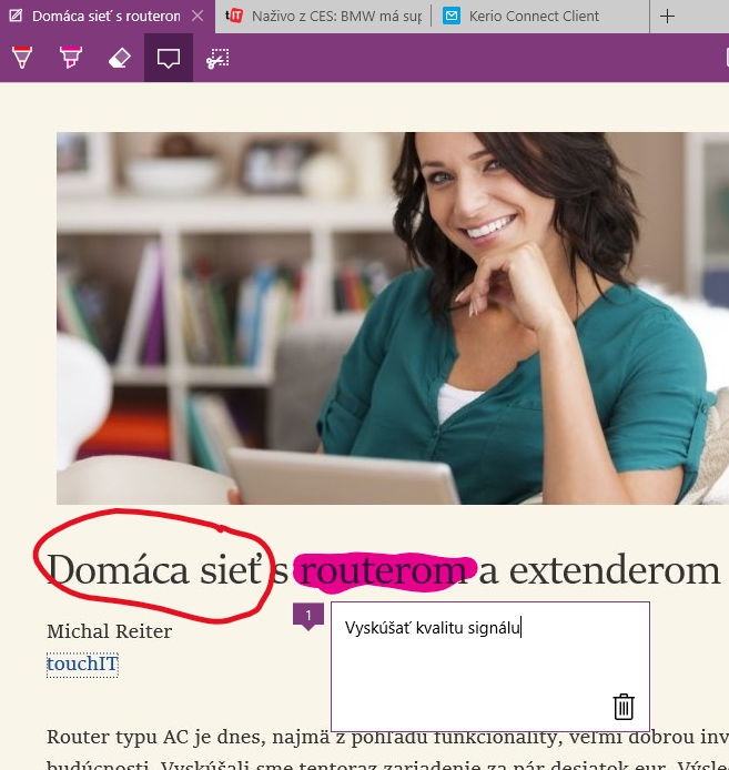 Do popredia záujmu sa prehliadač Edge dostal vďaka možnosti kresliť a robiť si poznámky priamo na webových stránkach. Môžete si na nich zakresľovať, zvýrazňovať, gumovať už urobené poznámky a tiež pridávať komentáre vo forme bublín, ktoré sa po kliknutí na ich ikonu zobrazia. Podobne ako pri komentároch vo Worde alebo v Exceli. Takúto stránku môžete uložiť a bude sa zobrazovať medzi zoznamom článkov na off-line prečítanie. Tiež sa dá exportovať do programu OneNote. My používame OneNote 2013 s úpravami a poznámky sa zobrazili aj tu. Poznámkový blok máme totiž uložený na OneDrive. Nezáleží teda na tom, či k nemu pristupujete z aplikácie pre Windows 10 alebo tzv. aplikácie pre pracovnú plochu alebo z mobilu. Poznámky sa nestratia a ide o ďalší spôsob ako si rýchlo niečo poznačiť a potom uložiť na neskoršie spracovanie.