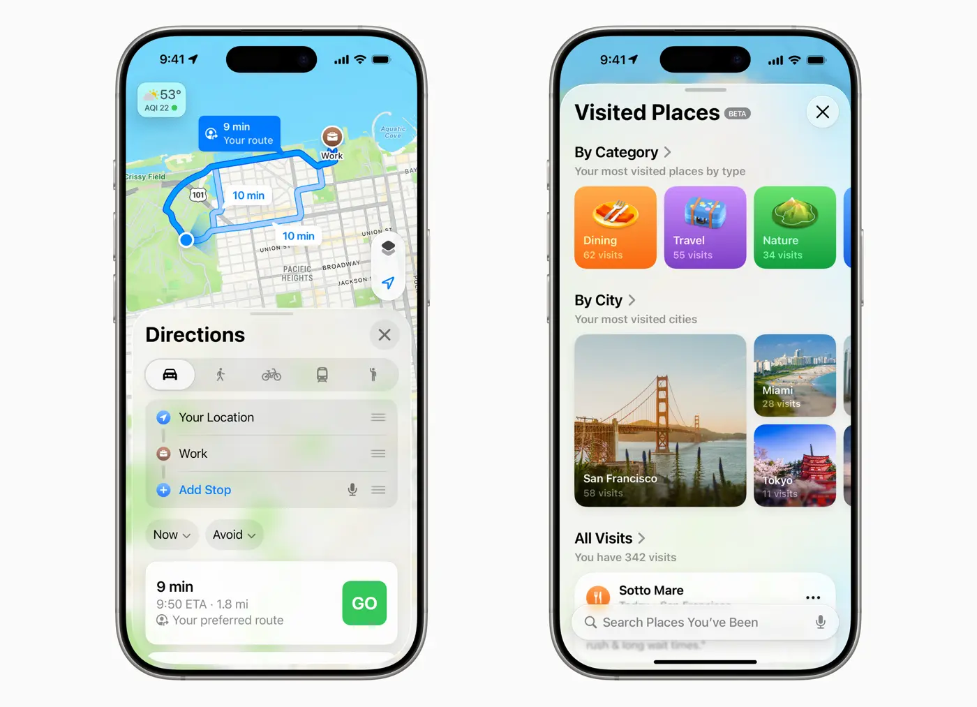 Mapy dostanú novú funkciu, ktorá bude zobrazovať v minulosti navštívené miesta. Ak ju budete chcieť využiť, môžete si nastaviť, aby iPhone rozpoznal, keď sa nachádzate na mieste, ako je reštaurácia alebo obchod. iPhone tiež môže pomocou umelej inteligencie lepšie pochopiť vaše každodenné trasy a pri ceste domov alebo do kancelárie vám zobrazí preferovanú trasu spolu s upozornením na prípadné meškanie s ponukou alternatívnych trás.