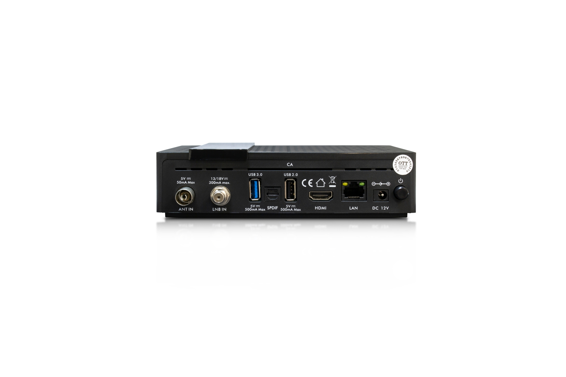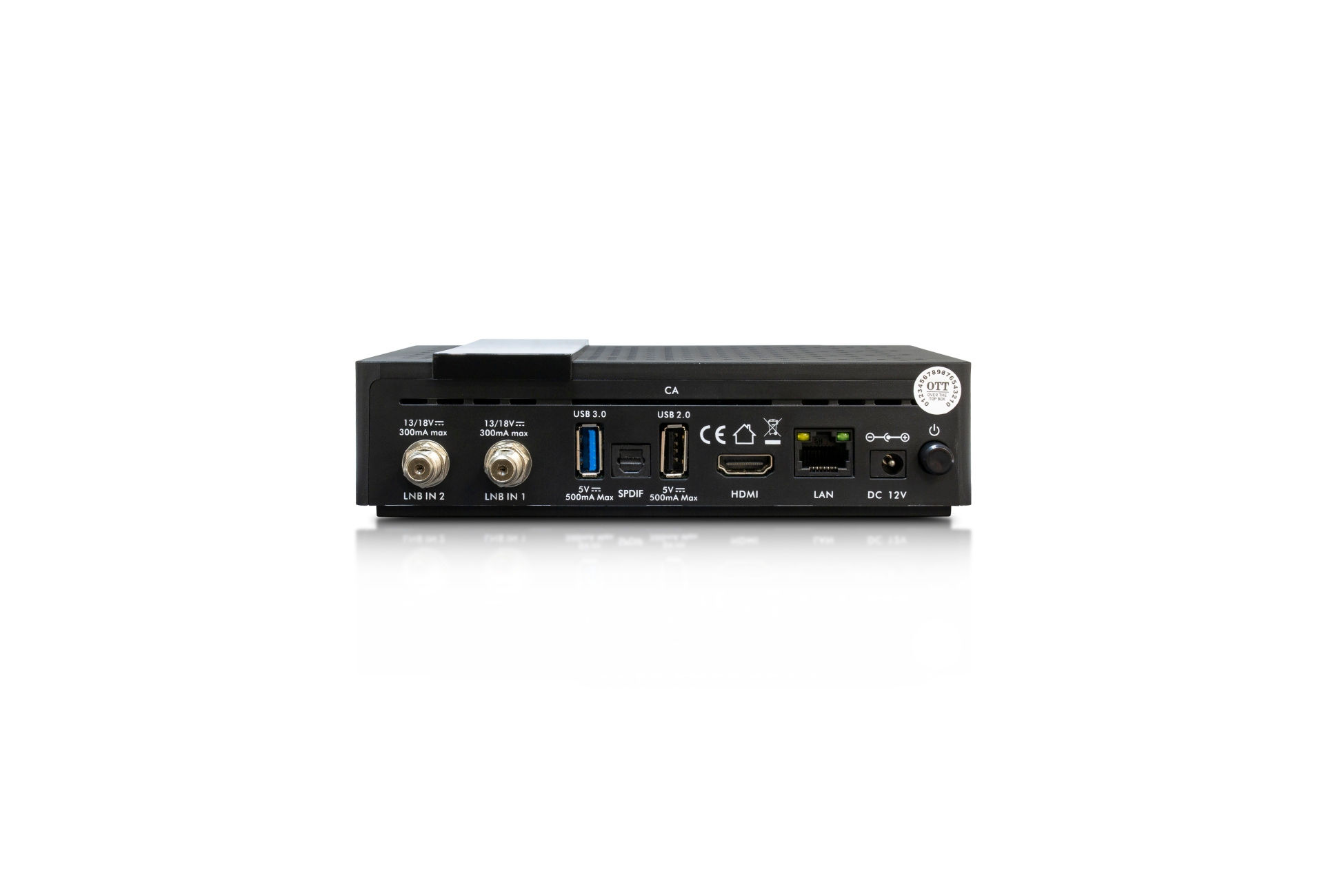 Vzadu sú v prípade verzie TWO dva satelitné tunery DVB-S2X, ďalej je tu slot pre čítačku kariet CA, port USB 3.0, USB 2.0, optický výstup zvuku S/PDIF, HDMI pripojenie, ethernet RJ45 a konektor pre 12 V externý zdroj + sieťový vypínač. Na boku sa nachádza slot na microSD kartu, na ktorú môžete nahrávať vysielanie. Nahrávky môžete ukladať aj na externý disk alebo USB kľúč. Preferovali sme nahrávanie na microSD kartu, na 32 GB kartu zmestíte viac ako 12 hodín nahrávok.