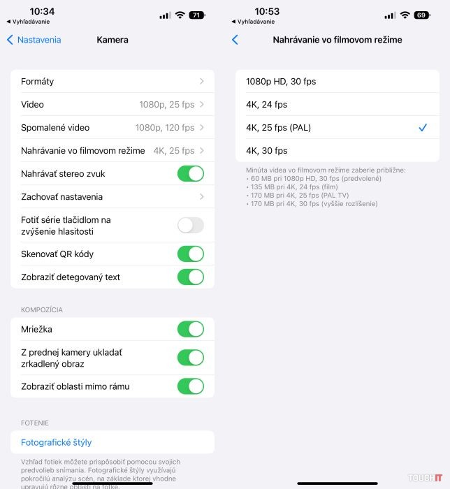 Rozlíšenie filmového režimu si môžete upraviť v Nastaveniach > Kamera > Nahrávanie vo filmovom režime. Potešiteľné je, že k dispozícii sú aj nastavenia 4K/24 fps a 4K/25 fps. Filmový režim môžete využiť na hlavnom aj prednom fotoaparáte.