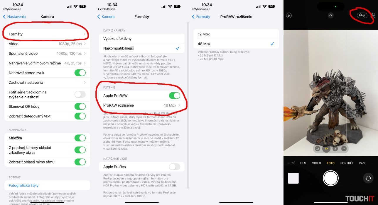 ProRAW si môžete aktivovať v Nastaveniach > Kamera > Formáty > Apple ProRAW. Zároveň si môžete zvoliť rozlíšenie ProRAW režimu. K dispozícii je 12 Mpx a 48 Mpx rozlíšenie s približnou veľkosťou fotiek na úrovni 25, resp. 75 MB.