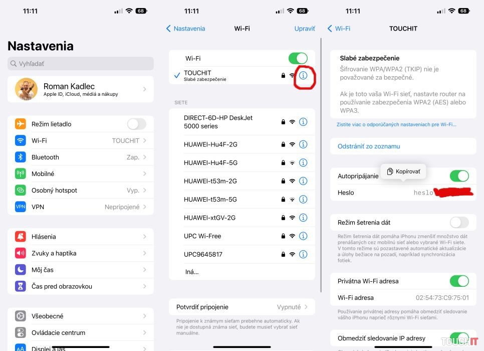 Stačí ísť do Nastavení > Wi-Fi a ťuknúť na sieť, do ktorej je telefón pripojený. Ťuknite potom na ikonu „i“, čím sa dostanete na obrazovku s detailnými informáciami o Wi-Fi sieti a práve tu nájdete novú položku Heslo. Ťuknite na ňu, heslo do Wi-Fi siete sa zobrazí a môžete ho jednoducho skopírovať alebo ukázať človeku, ktorý sa chce do danej Wi-Fi siete tiež pripojiť.