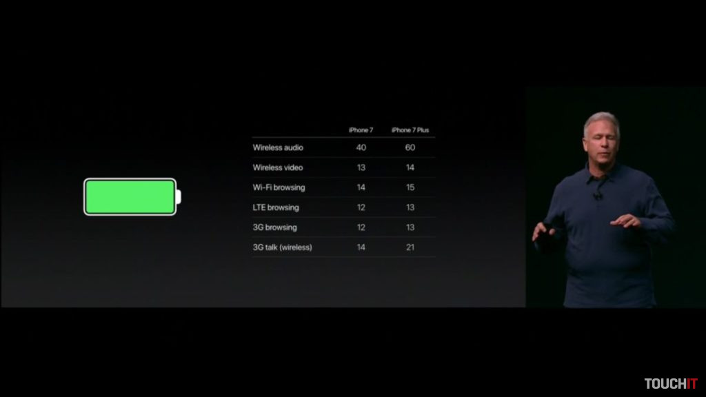 Apple sa chválil, že iPhone 7 ponúka o 2 hodiny dlhšiu výdrž v porovnaní s predchodcom. Platí to v prípade surfovania na internete a sledovania videa. Výdrž pri telefonovaní však ostáva rovnaká. V prípade Plus verzie je dokonca kratšia o 3 hodiny. Aj hudbu budete počúvať na novom iPhone o 10 hodín kratšie (o 20 hodín v prípade Plus verzie) na jedno nabitie v porovnaní s predchodcom. Je to však dané tým, že Apple predpokladá použitie bezdrôtových slúchadiel.