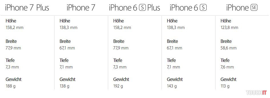 Hoci sú rozmery telefónov iPhone 7 a 6s, resp. 7 Plus a 6s Plus rovnaké, novinky sú 4 – 5 gramov ľahšie. iPhone 7 váži 138 gramov, verzia Plus je o 50 gramov ťažšia.