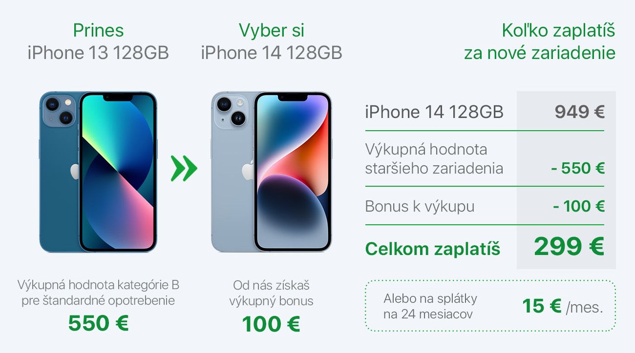 Znamená to, že za iPhone 14 (128GB) v hodnote 949 eur zaplatíte po výkupe iPhonu 13 (128GB) a 100 eur výkupnej zľavy iba 299 eur. Zvyšnú sumu si môžete rozdeliť aj na mesačné splátky, takže pri dobe splácania 24 mesiacov bude vaša mesačná splátka len 15 eur.