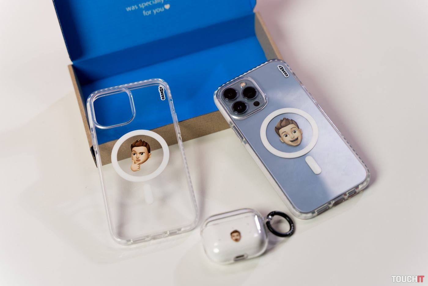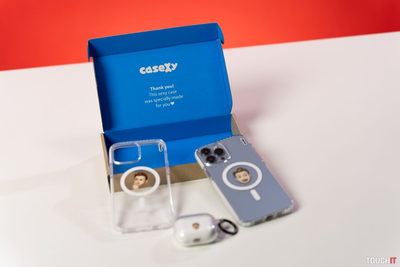 Casexy tiež ponúka memoji obal pre AirPody. Je vyrobený z tvrdého TPU plastu a rozdelený do dvoch častí. Jedná časť chráni otváraciu časť, druhá časť ochraňuje zvyšok nabíjacieho puzdra. Puzdro slúchadiel je potrebné vložiť do ochranného obalu správnym smerom, pretože v opačnom prípade bude horná časť obalu vyskakovať pri otváraní puzdra.